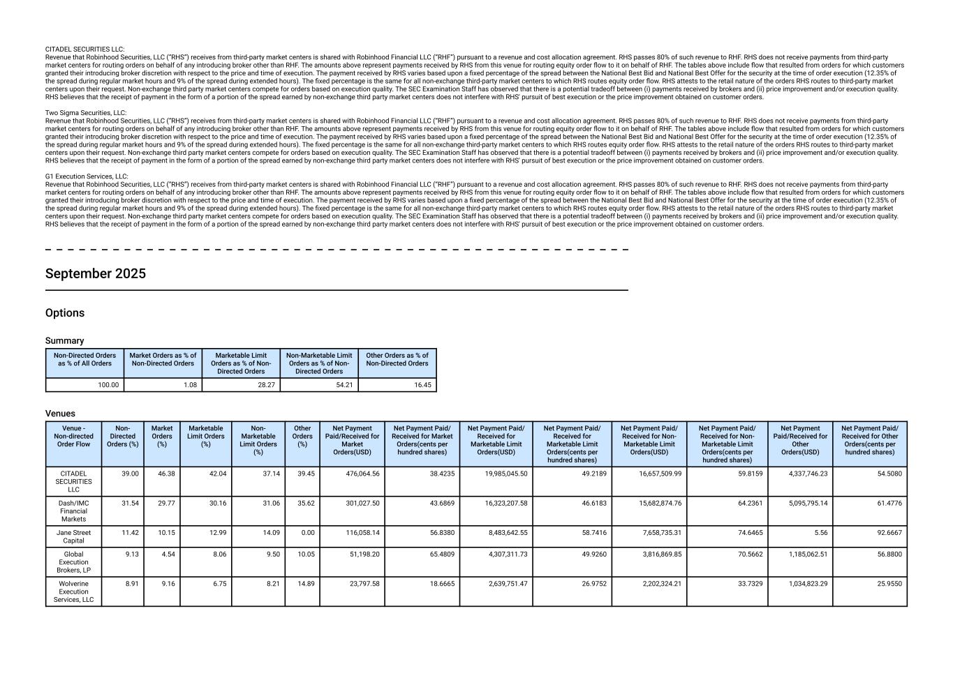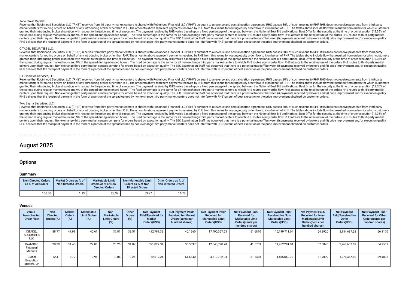 CITADEL SECURITIES LLC: Revenue that Robinhood Securities, LLC (“RHS”) receives from third-party market centers is shared with Robinhood Financial LLC (“RHF”) pursuant to a revenue and cost allocation agreement. RHS passes 80% of such revenue to RHF. RHS does not receive payments from third-party market centers for routing orders on behalf of any introducing broker other than RHF. The amounts above represent payments received by RHS from this venue for routing equity order flow to it on behalf of RHF. The tables above include flow that resulted from orders for which customers granted their introducing broker discretion with respect to the price and time of execution. The payment received by RHS varies based upon a fixed percentage of the spread between the National Best Bid and National Best Offer for the security at the time of order execution (12.35% of the spread during regular market hours and 9% of the spread during extended hours). The fixed percentage is the same for all non-exchange third-party market centers to which RHS routes equity order flow. RHS attests to the retail nature of the orders RHS routes to third-party market centers upon their request. Non-exchange third party market centers compete for orders based on execution quality. The SEC Examination Staff has observed that there is a potential tradeoff between (i) payments received by brokers and (ii) price improvement and/or execution quality. RHS believes that the receipt of payment in the form of a portion of the spread earned by non-exchange third party market centers does not interfere with RHS' pursuit of best execution or the price improvement obtained on customer orders. Two Sigma Securities, LLC: Revenue that Robinhood Securities, LLC (“RHS”) receives from third-party market centers is shared with Robinhood Financial LLC (“RHF”) pursuant to a revenue and cost allocation agreement. RHS passes 80% of such revenue to RHF. RHS does not receive payments from third-party market centers for routing orders on behalf of any introducing broker other than RHF. The amounts above represent payments received by RHS from this venue for routing equity order flow to it on behalf of RHF. The tables above include flow that resulted from orders for which customers granted their introducing broker discretion with respect to the price and time of execution. The payment received by RHS varies based upon a fixed percentage of the spread between the National Best Bid and National Best Offer for the security at the time of order execution (12.35% of the spread during regular market hours and 9% of the spread during extended hours). The fixed percentage is the same for all non-exchange third-party market centers to which RHS routes equity order flow. RHS attests to the retail nature of the orders RHS routes to third-party market centers upon their request. Non-exchange third party market centers compete for orders based on execution quality. The SEC Examination Staff has observed that there is a potential tradeoff between (i) payments received by brokers and (ii) price improvement and/or execution quality. RHS believes that the receipt of payment in the form of a portion of the spread earned by non-exchange third party market centers does not interfere with RHS' pursuit of best execution or the price improvement obtained on customer orders. G1 Execution Services, LLC: Revenue that Robinhood Securities, LLC (“RHS”) receives from third-party market centers is shared with Robinhood Financial LLC (“RHF”) pursuant to a revenue and cost allocation agreement. RHS passes 80% of such revenue to RHF. RHS does not receive payments from third-party market centers for routing orders on behalf of any introducing broker other than RHF. The amounts above represent payments received by RHS from this venue for routing equity order flow to it on behalf of RHF. The tables above include flow that resulted from orders for which customers granted their introducing broker discretion with respect to the price and time of execution. The payment received by RHS varies based upon a fixed percentage of the spread between the National Best Bid and National Best Offer for the security at the time of order execution (12.35% of the spread during regular market hours and 9% of the spread during extended hours). The fixed percentage is the same for all non-exchange third-party market centers to which RHS routes equity order flow. RHS attests to the retail nature of the orders RHS routes to third-party market centers upon their request. Non-exchange third party market centers compete for orders based on execution quality. The SEC Examination Staff has observed that there is a potential tradeoff between (i) payments received by brokers and (ii) price improvement and/or execution quality. RHS believes that the receipt of payment in the form of a portion of the spread earned by non-exchange third party market centers does not interfere with RHS' pursuit of best execution or the price improvement obtained on customer orders. September 2025 Options Summary Non-Directed Orders as % of All Orders Market Orders as % of Non-Directed Orders Marketable Limit Orders as % of Non- Directed Orders Non-Marketable Limit Orders as % of Non- Directed Orders Other Orders as % of Non-Directed Orders 100.00 1.08 28.27 54.21 16.45 Venues Venue - Non-directed Order Flow Non- Directed Orders (%) Market Orders (%) Marketable Limit Orders (%) Non- Marketable Limit Orders (%) Other Orders (%) Net Payment Paid/Received for Market Orders(USD) Net Payment Paid/ Received for Market Orders(cents per hundred shares) Net Payment Paid/ Received for Marketable Limit Orders(USD) Net Payment Paid/ Received for Marketable Limit Orders(cents per hundred shares) Net Payment Paid/ Received for Non- Marketable Limit Orders(USD) Net Payment Paid/ Received for Non- Marketable Limit Orders(cents per hundred shares) Net Payment Paid/Received for Other Orders(USD) Net Payment Paid/ Received for Oth