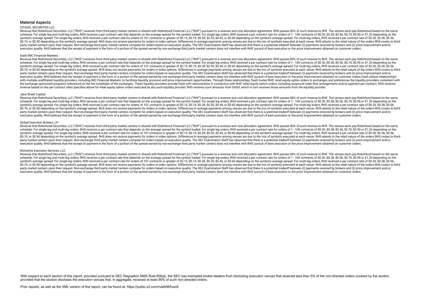 Material Aspects: CITADEL SECURITIES LLC: Revenue that Robinhood Securities, LLC (“RHS”) receives from third-party market centers is shared with Robinhood Financial LLC (“RHF”) pursuant to a revenue and cost allocation agreement. RHS passes 80% of such revenue to RHF. The venues each pay Robinhood based on the same schedule. For single leg and multi-leg orders, RHS receives a per contract rate that depends on the average spread for the symbol traded. For single leg orders, RHS received a per contract rate for orders of 1 - 100 contracts of $0.30, $0.38, $0.56, $0.70, $0.90 or $1.20 depending on the symbol’s average spread. For single leg orders, RHS received a per contract rate for orders of 101 contracts or greater of $0.15, $0.19, $0.28, $0.35, $0.45, or $0.60 depending on the symbol’s average spread. For multi-leg orders, RHS received a per contract rate of $0.30, $0.38, $0.56, $0.70, or $0.90 depending on the symbol’s average spread. RHS does not receive payments for orders in index options. Differences in average payments among venues are due to the mix of symbols executed at each venue. RHS attests to the retail nature of the orders RHS routes to third- party market centers upon their request. Non-exchange third party market centers compete for orders based on execution quality. The SEC Examination Staff has observed that there is a potential tradeoff between (i) payments received by brokers and (ii) price improvement and/or execution quality. RHS believes that the receipt of payment in the form of a portion of the spread earned by non-exchange third party market centers does not interfere with RHS' pursuit of best execution or the price improvement obtained on customer orders. Dash/IMC Financial Markets: Revenue that Robinhood Securities, LLC (“RHS”) receives from third-party market centers is shared with Robinhood Financial LLC (“RHF”) pursuant to a revenue and cost allocation agreement. RHS passes 80% of such revenue to RHF. The venues each pay Robinhood based on the same schedule. For single leg and multi-leg orders, RHS receives a per contract rate that depends on the average spread for the symbol traded. For single leg orders, RHS received a per contract rate for orders of 1 - 100 contracts of $0.30, $0.38, $0.56, $0.70, $0.90 or $1.20 depending on the symbol’s average spread. For single leg orders, RHS received a per contract rate for orders of 101 contracts or greater of $0.15, $0.19, $0.28, $0.35, $0.45, or $0.60 depending on the symbol’s average spread. For multi-leg orders, RHS received a per contract rate of $0.30, $0.38, $0.56, $0.70, or $0.90 depending on the symbol’s average spread. RHS does not receive payments for orders in index options. Differences in average payments among venues are due to the mix of symbols executed at each venue. RHS attests to the retail nature of the orders RHS routes to third- party market centers upon their request. Non-exchange third party market centers compete for orders based on execution quality. The SEC Examination Staff has observed that there is a potential tradeoff between (i) payments received by brokers and (ii) price improvement and/or execution quality. RHS believes that the receipt of payment in the form of a portion of the spread earned by non-exchange third party market centers does not interfere with RHS' pursuit of best execution or the price improvement obtained on customer orders.Dash utilizes relationships with multiple unaffiliated liquidity providers, including IMC Financial Markets, to facilitate liquidity provision and price improvement opportunities. Through these relationships, Dash routes RHS’ retail equity option orders to exchanges and preferences the liquidity providers consistent with the exchange sponsored programs referenced on the fee schedules of the exchanges. These liquidity providers provide Dash with remuneration in connection with RHS’ retail equity option orders, including reciprocal order flow arrangements and/or payment per contract. RHS receives revenue based on the per contract rates specified above for retail equity option orders executed by any such liquidity provider; RHS receives such amounts from DASH, which in turn receives those amounts from the liquidity provider. Jane Street Capital: Revenue that Robinhood Securities, LLC (“RHS”) receives from third-party market centers is shared with Robinhood Financial LLC (“RHF”) pursuant to a revenue and cost allocation agreement. RHS passes 80% of such revenue to RHF. The venues each pay Robinhood based on the same schedule. For single leg and multi-leg orders, RHS receives a per contract rate that depends on the average spread for the symbol traded. For single leg orders, RHS received a per contract rate for orders of 1 - 100 contracts of $0.30, $0.38, $0.56, $0.70, $0.90 or $1.20 depending on the symbol’s average spread. For single leg orders, RHS received a per contract rate for orders of 101 contracts or greater of $0.15, $0.19, $0.28, $0.35, $0.45, or $0.60 depending on the symbol’s average spread. For multi-leg orders, RHS received a per contract rate of $0.30, $0.38, $0.56, $0.70, or $0.90 depending on the symbol’s average spread. RHS does not receive payments for orders in index options. Differences in average payments among venues are due to the mix of symbols executed at each venue. RHS attests to the retail nature of the orders RHS routes to third- party market centers upon their request. Non-exchange third party market centers compete for orders based on execution quality. The SEC Examination Staff has observed that there is a potential tradeoff between (i) payments received by brokers and (ii) price improvement and/or execution quality. RHS believes that the receipt of payment in the form of a portion of the spread earned by non-exchange third party market centers does not interfere with RHS' pursuit of best execution or the price improvement obtained on customer orders. Global Execution 
