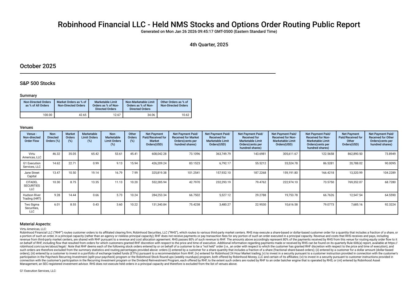 Robinhood Financial LLC - Held NMS Stocks and Options Order Routing Public Report Generated on Mon Jan 26 2026 09:45:17 GMT-0500 (Eastern Standard Time) 4th Quarter, 2025 October 2025 S&P 500 Stocks Summary Non-Directed Orders as % of All Orders Market Orders as % of Non-Directed Orders Marketable Limit Orders as % of Non- Directed Orders Non-Marketable Limit Orders as % of Non- Directed Orders Other Orders as % of Non-Directed Orders 100.00 42.65 12.67 34.06 10.62 Venues Venue - Non-directed Order Flow Non- Directed Orders (%) Market Orders (%) Marketable Limit Orders (%) Non- Marketable Limit Orders (%) Other Orders (%) Net Payment Paid/Received for Market Orders(USD) Net Payment Paid/ Received for Market Orders(cents per hundred shares) Net Payment Paid/ Received for Marketable Limit Orders(USD) Net Payment Paid/ Received for Marketable Limit Orders(cents per hundred shares) Net Payment Paid/ Received for Non- Marketable Limit Orders(USD) Net Payment Paid/ Received for Non- Marketable Limit Orders(cents per hundred shares) Net Payment Paid/Received for Other Orders(USD) Net Payment Paid/ Received for Other Orders(cents per hundred shares) Virtu Americas, LLC 46.32 35.05 65.42 53.61 45.41 608,042.28 73.1096 363,749.79 143.6981 305,611.67 122.5658 862,890.50 73.8949 G1 Execution Services, LLC 14.62 22.71 0.99 9.13 15.94 426,209.24 83.1523 6,792.17 55.5212 33,524.78 86.5281 20,788.02 90.0095 Jane Street Capital 13.47 10.50 19.14 16.79 7.99 325,819.38 101.2541 157,932.10 187.2268 159,191.80 166.4218 13,320.99 104.2289 CITADEL SECURITIES LLC 10.30 8.75 13.35 11.13 10.20 552,285.94 42.7970 232,293.19 79.4762 222,974.10 73.5750 769,352.07 68.7280 Hudson River Trading (HRT) 9.28 14.44 0.66 5.73 10.24 284,253.34 66.7502 5,527.12 29.2788 19,753.78 66.7626 12,547.54 64.5590 Two Sigma Securities, LLC 6.01 8.55 0.43 3.60 10.22 131,340.84 75.4238 3,480.27 22.9530 10,616.58 79.0773 7,685.16 92.3224 Material Aspects: Virtu Americas, LLC: Robinhood Financial LLC (“RHF”) routes customer orders to its affiliated clearing firm, Robinhood Securities, LLC (“RHS”), which routes to various third-party market centers. RHS may execute a share-based or dollar-based customer order for a quantity that includes a fraction of a share, or a portion of such an order, in a principal capacity (rather than an agency or riskless principal capacity); RHF does not receive payments or pay transaction fees for any portion of such an order executed in a principal capacity. Revenue and costs that RHS receives and pays, including revenue from third-party market centers, are shared with RHF pursuant to a revenue and cost allocation agreement. RHS passes 80% of such revenue to RHF. The amounts above accordingly represent 80% of the payments received by RHS from this venue for routing equity order flow to it on behalf of RHF, including flow that resulted from orders for which customers granted RHF discretion with respect to the price and time of execution. Additional information regarding payments made or received by RHS can be found on its quarterly Rule 606(a) report, available at https:// robinhood.com/us/en/about/legal/. Note that RHF deems each of the following stock orders entered by or on behalf of a customer to be a “not held” order (i.e., an order with respect to which the customer has granted RHF discretion with respect to the price and time of execution), and such orders are therefore excluded from the summary statistics and routing percentages provided above: orders (i) entered by a customer for a share quantity that includes a fraction of a share (fractional share-based orders); (ii) entered by a customer for a dollar amount (dollar-based orders); (iii) entered by a customer to invest in a portfolio of exchange traded funds (ETFs) pursuant to a recommendation from RHF; (iv) entered for Robinhood 24 Hour Market trading; (v) to invest in a security pursuant to a customer instruction provided in connection with the customer’s participation in the Paycheck Recurring Investment (split-your-paycheck) program or the Robinhood Stock Round-ups (weekly roundups) program, both offered by Robinhood Money, LLC and certain of its affiliates; (vi) to invest in a security pursuant to customer instructions provided in connection with the customer’s participation in the Recurring Investment program or the Dividend Reinvestment Program, each offered by RHF, to the extent such orders are routed by RHF to an order batcher engine that is operated by RHS; or (vii) entered by Robinhood Asset Management, an SEC-registered investment advisor. RHS does not execute held orders in a principal capacity and therefore is excluded from the list of venues above. G1 Execution Services, LLC: