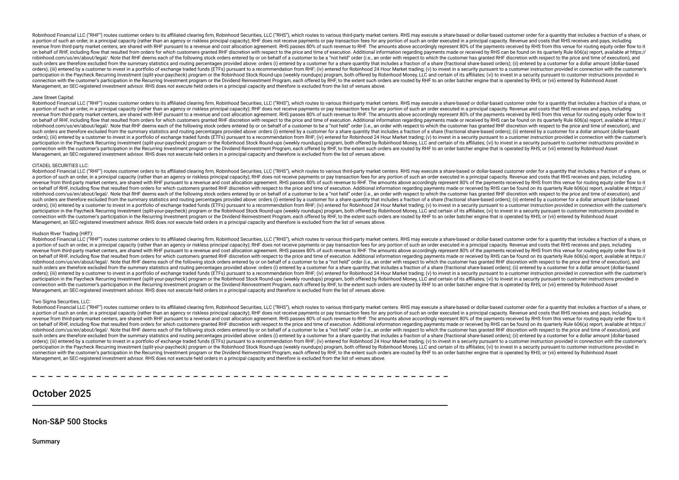 Robinhood Financial LLC (“RHF”) routes customer orders to its affiliated clearing firm, Robinhood Securities, LLC (“RHS”), which routes to various third-party market centers. RHS may execute a share-based or dollar-based customer order for a quantity that includes a fraction of a share, or a portion of such an order, in a principal capacity (rather than an agency or riskless principal capacity); RHF does not receive payments or pay transaction fees for any portion of such an order executed in a principal capacity. Revenue and costs that RHS receives and pays, including revenue from third-party market centers, are shared with RHF pursuant to a revenue and cost allocation agreement. RHS passes 80% of such revenue to RHF. The amounts above accordingly represent 80% of the payments received by RHS from this venue for routing equity order flow to it on behalf of RHF, including flow that resulted from orders for which customers granted RHF discretion with respect to the price and time of execution. Additional information regarding payments made or received by RHS can be found on its quarterly Rule 606(a) report, available at https:// robinhood.com/us/en/about/legal/. Note that RHF deems each of the following stock orders entered by or on behalf of a customer to be a “not held” order (i.e., an order with respect to which the customer has granted RHF discretion with respect to the price and time of execution), and such orders are therefore excluded from the summary statistics and routing percentages provided above: orders (i) entered by a customer for a share quantity that includes a fraction of a share (fractional share-based orders); (ii) entered by a customer for a dollar amount (dollar-based orders); (iii) entered by a customer to invest in a portfolio of exchange traded funds (ETFs) pursuant to a recommendation from RHF; (iv) entered for Robinhood 24 Hour Market trading; (v) to invest in a security pursuant to a customer instruction provided in connection with the customer’s participation in the Paycheck Recurring Investment (split-your-paycheck) program or the Robinhood Stock Round-ups (weekly roundups) program, both offered by Robinhood Money, LLC and certain of its affiliates; (vi) to invest in a security pursuant to customer instructions provided in connection with the customer’s participation in the Recurring Investment program or the Dividend Reinvestment Program, each offered by RHF, to the extent such orders are routed by RHF to an order batcher engine that is operated by RHS; or (vii) entered by Robinhood Asset Management, an SEC-registered investment advisor. RHS does not execute held orders in a principal capacity and therefore is excluded from the list of venues above. CITADEL SECURITIES LLC: Robinhood Financial LLC (“RHF”) routes customer orders to its affiliated clearing firm, Robinhood Securities, LLC (“RHS”), which routes to various third-party market centers. RHS may execute a share-based or dollar-based customer order for a quantity that includes a fraction of a share, or a portion of such an order, in a principal capacity (rather than an agency or riskless principal capacity); RHF does not receive payments or pay transaction fees for any portion of such an order executed in a principal capacity. Revenue and costs that RHS receives and pays, including revenue from third-party market centers, are shared with RHF pursuant to a revenue and cost allocation agreement. RHS passes 80% of such revenue to RHF. The amounts above accordingly represent 80% of the payments received by RHS from this venue for routing equity order flow to it on behalf of RHF, including flow that resulted from orders for which customers granted RHF discretion with respect to the price and time of execution. Additional information regarding payments made or received by RHS can be found on its quarterly Rule 606(a) report, available at https:// robinhood.com/us/en/about/legal/. Note that RHF deems each of the following stock orders entered by or on behalf of a customer to be a “not held” order (i.e., an order with respect to which the customer has granted RHF discretion with respect to the price and time of execution), and such orders are therefore excluded from the summary statistics and routing percentages provided above: orders (i) entered by a customer for a share quantity that includes a fraction of a share (fractional share-based orders); (ii) entered by a customer for a dollar amount (dollar-based orders); (iii) entered by a customer to invest in a portfolio of exchange traded funds (ETFs) pursuant to a recommendation from RHF; (iv) entered for Robinhood 24 Hour Market trading; (v) to invest in a security pursuant to a customer instruction provided in connection with the customer’s participation in the Paycheck Recurring Investment (split-your-paycheck) program or the Robinhood Stock Round-ups (weekly roundups) program, both offered by Robinhood Money, LLC and certain of its affiliates; (vi) to invest in a security pursuant to customer instructions provided in connection with the customer’s participation in the Recurring Investment program or the Dividend Reinvestment Program, each offered by RHF, to the extent such orders are routed by RHF to an order batcher engine that is operated by RHS; or (vii) entered by Robinhood Asset Management, an SEC-registered investment advisor. RHS does not execute held orders in a principal capacity and therefore is excluded from the list of venues above. Jane Street Capital: Robinhood Financial LLC (“RHF”) routes customer orders to its affiliated clearing firm, Robinhood Securities, LLC (“RHS”), which routes to various third-party market centers. RHS may execute a share-based or dollar-based customer order for a quantity that includes a fraction of a share, or a portion of such an order, in a principal capacity (rather than an agency or riskless principal capacity); RHF does not receive payments or pay transaction fees for any 