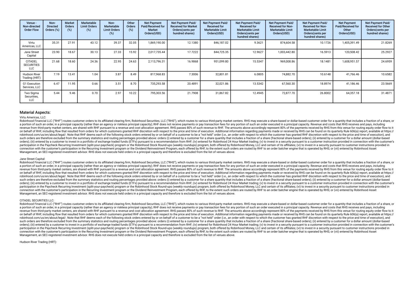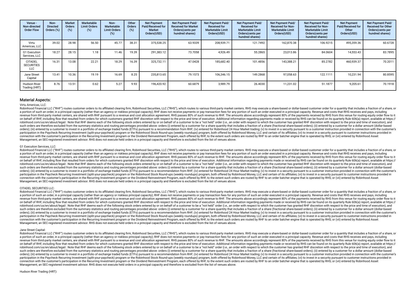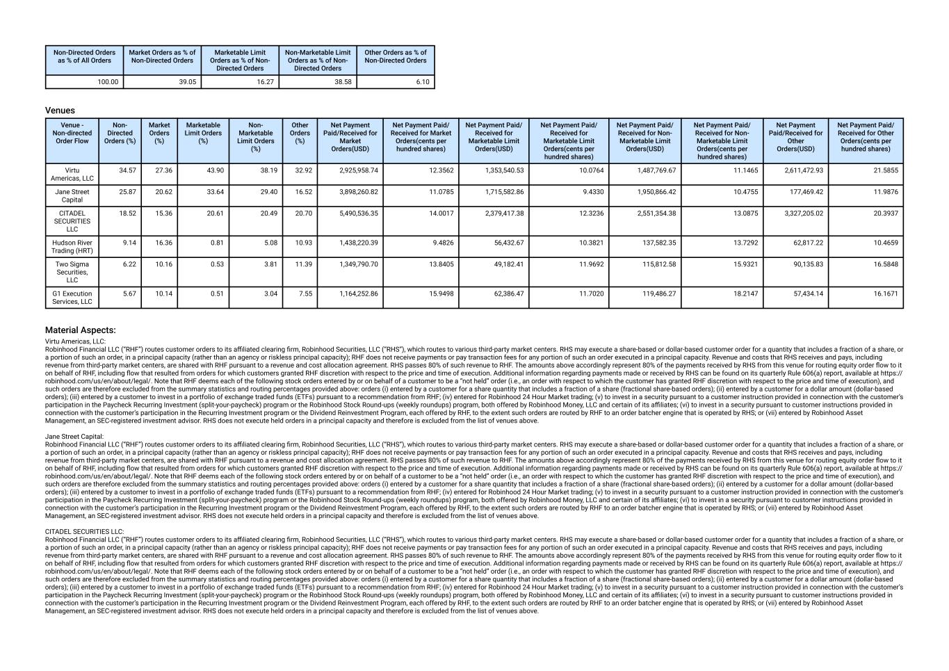 Venue - Non-directed Order Flow Non- Directed Orders (%) Market Orders (%) Marketable Limit Orders (%) Non- Marketable Limit Orders (%) Other Orders (%) Net Payment Paid/Received for Market Orders(USD) Net Payment Paid/ Received for Market Orders(cents per hundred shares) Net Payment Paid/ Received for Marketable Limit Orders(USD) Net Payment Paid/ Received for Marketable Limit Orders(cents per hundred shares) Net Payment Paid/ Received for Non- Marketable Limit Orders(USD) Net Payment Paid/ Received for Non- Marketable Limit Orders(cents per hundred shares) Net Payment Paid/Received for Other Orders(USD) Net Payment Paid/ Received for Other Orders(cents per hundred shares) Virtu Americas, LLC 39.02 28.98 56.50 45.77 38.31 375,538.25 63.9339 208,939.71 121.7492 162,870.38 106.9215 495,359.36 60.6728 G1 Execution Services, LLC 18.27 28.15 1.18 11.46 19.39 291,383.12 73.7058 4,926.49 55.2865 23,013.86 84.0604 14,553.43 83.7895 CITADEL SECURITIES LLC 16.31 13.08 22.21 18.29 16.39 325,732.11 47.0428 185,682.40 101.4856 143,388.21 85.2782 460,939.37 70.2011 Jane Street Capital 13.41 10.36 19.19 16.69 8.25 235,813.65 79.1573 106,346.15 149.2868 97,058.63 122.1111 10,231.94 80.8595 Hudson River Trading (HRT) 8.76 13.51 0.62 5.27 9.93 196,420.92 60.6879 3,989.79 26.4030 11,231.02 51.1877 9,205.61 70.1918 Material Aspects: Virtu Americas, LLC: Robinhood Financial LLC (“RHF”) routes customer orders to its affiliated clearing firm, Robinhood Securities, LLC (“RHS”), which routes to various third-party market centers. RHS may execute a share-based or dollar-based customer order for a quantity that includes a fraction of a share, or a portion of such an order, in a principal capacity (rather than an agency or riskless principal capacity); RHF does not receive payments or pay transaction fees for any portion of such an order executed in a principal capacity. Revenue and costs that RHS receives and pays, including revenue from third-party market centers, are shared with RHF pursuant to a revenue and cost allocation agreement. RHS passes 80% of such revenue to RHF. The amounts above accordingly represent 80% of the payments received by RHS from this venue for routing equity order flow to it on behalf of RHF, including flow that resulted from orders for which customers granted RHF discretion with respect to the price and time of execution. Additional information regarding payments made or received by RHS can be found on its quarterly Rule 606(a) report, available at https:// robinhood.com/us/en/about/legal/. Note that RHF deems each of the following stock orders entered by or on behalf of a customer to be a “not held” order (i.e., an order with respect to which the customer has granted RHF discretion with respect to the price and time of execution), and such orders are therefore excluded from the summary statistics and routing percentages provided above: orders (i) entered by a customer for a share quantity that includes a fraction of a share (fractional share-based orders); (ii) entered by a customer for a dollar amount (dollar-based orders); (iii) entered by a customer to invest in a portfolio of exchange traded funds (ETFs) pursuant to a recommendation from RHF; (iv) entered for Robinhood 24 Hour Market trading; (v) to invest in a security pursuant to a customer instruction provided in connection with the customer’s participation in the Paycheck Recurring Investment (split-your-paycheck) program or the Robinhood Stock Round-ups (weekly roundups) program, both offered by Robinhood Money, LLC and certain of its affiliates; (vi) to invest in a security pursuant to customer instructions provided in connection with the customer’s participation in the Recurring Investment program or the Dividend Reinvestment Program, each offered by RHF, to the extent such orders are routed by RHF to an order batcher engine that is operated by RHS; or (vii) entered by Robinhood Asset Management, an SEC-registered investment advisor. RHS does not execute held orders in a principal capacity and therefore is excluded from the list of venues above. G1 Execution Services, LLC: Robinhood Financial LLC (“RHF”) routes customer orders to its affiliated clearing firm, Robinhood Securities, LLC (“RHS”), which routes to various third-party market centers. RHS may execute a share-based or dollar-based customer order for a quantity that includes a fraction of a share, or a portion of such an order, in a principal capacity (rather than an agency or riskless principal capacity); RHF does not receive payments or pay transaction fees for any portion of such an order executed in a principal capacity. Revenue and costs that RHS receives and pays, including revenue from third-party market centers, are shared with RHF pursuant to a revenue and cost allocation agreement. RHS passes 80% of such revenue to RHF. The amounts above accordingly represent 80% of the payments received by RHS from this venue for routing equity order flow to it on behalf of RHF, including flow that resulted from orders for which customers granted RHF discretion with respect to the price and time of execution. Additional information regarding payments made or received by RHS can be found on its quarterly Rule 606(a) report, available at https:// robinhood.com/us/en/about/legal/. Note that RHF deems each of the following stock orders entered by or on behalf of a customer to be a “not held” order (i.e., an order with respect to which the customer has granted RHF discretion with respect to the price and time of execution), and such orders are therefore excluded from the summary statistics and routing percentages provided above: orders (i) entered by a customer for a share quantity that includes a fraction of a share (fractional share-based orders); (ii) entered by a customer for a dollar amount (dollar-based orders); (iii) entered by a customer to invest in a portfolio of exchange traded funds (ETFs) pursuant to a recommendation from RHF; (iv) enter