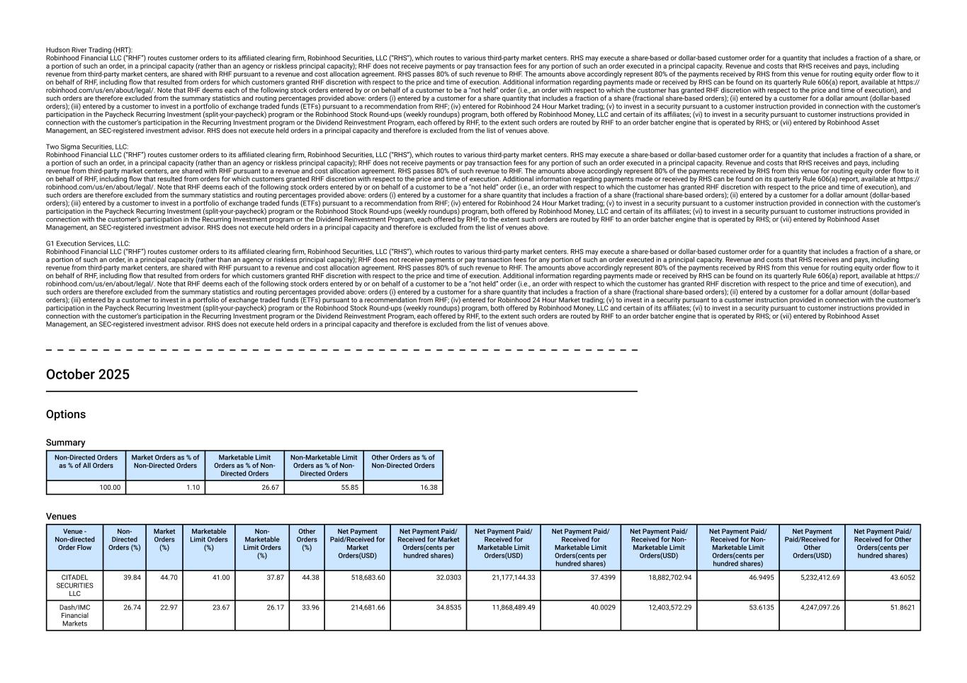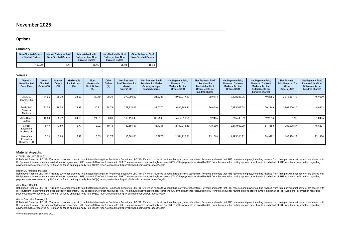 November 2025 Options Summary Non-Directed Orders as % of All Orders Market Orders as % of Non-Directed Orders Marketable Limit Orders as % of Non- Directed Orders Non-Marketable Limit Orders as % of Non- Directed Orders Other Orders as % of Non-Directed Orders 100.00 1.41 26.46 55.18 16.94 Venues Venue - Non-directed Order Flow Non- Directed Orders (%) Market Orders (%) Marketable Limit Orders (%) Non- Marketable Limit Orders (%) Other Orders (%) Net Payment Paid/Received for Market Orders(USD) Net Payment Paid/ Received for Market Orders(cents per hundred shares) Net Payment Paid/ Received for Marketable Limit Orders(USD) Net Payment Paid/ Received for Marketable Limit Orders(cents per hundred shares) Net Payment Paid/ Received for Non- Marketable Limit Orders(USD) Net Payment Paid/ Received for Non- Marketable Limit Orders(cents per hundred shares) Net Payment Paid/Received for Other Orders(USD) Net Payment Paid/ Received for Other Orders(cents per hundred shares) CITADEL SECURITIES LLC 34.05 36.32 34.63 32.40 38.32 373,009.07 31.3206 12,933,977.20 38.9214 12,428,288.06 49.2855 3,815,867.42 46.9609 Dash/IMC Financial Markets 31.58 28.54 28.93 30.71 38.78 258,916.67 33.0275 9,810,793.91 36.0610 10,395,503.58 50.2249 3,869,206.26 48.9372 Jane Street Capital 18.53 25.72 24.19 21.31 0.00 180,498.40 30.9500 6,464,593.66 39.9486 6,255,449.39 52.2094 1.92 1.0435 Global Execution Brokers, LP 8.49 3.59 6.77 8.92 10.15 32,601.87 46.4361 2,413,313.48 43.5000 2,313,963.38 61.4683 788,098.57 46.5521 Wolverine Execution Services, LLC 7.36 5.84 5.48 6.65 12.75 15,801.66 16.3875 1,546,726.21 23.1068 1,395,266.22 28.9282 688,428.28 22.1426 Material Aspects: CITADEL SECURITIES LLC: Robinhood Financial LLC (“RHF”) routes customer orders to its affiliated clearing firm, Robinhood Securities, LLC (“RHS”), which routes to various third-party market centers. Revenue and costs that RHS receives and pays, including revenue from third-party market centers, are shared with RHF pursuant to a revenue and cost allocation agreement. RHS passes 80% of such revenue to RHF. The amounts above accordingly represent 80% of the payments received by RHS from this venue for routing options order flow to it on behalf of RHF. Additional information regarding payments made or received by RHS can be found on its quarterly Rule 606(a) report, available at http://robinhood.com/us/en/about/legal/. Dash/IMC Financial Markets: Robinhood Financial LLC (“RHF”) routes customer orders to its affiliated clearing firm, Robinhood Securities, LLC (“RHS”), which routes to various third-party market centers. Revenue and costs that RHS receives and pays, including revenue from third-party market centers, are shared with RHF pursuant to a revenue and cost allocation agreement. RHS passes 80% of such revenue to RHF. The amounts above accordingly represent 80% of the payments received by RHS from this venue for routing options order flow to it on behalf of RHF. Additional information regarding payments made or received by RHS can be found on its quarterly Rule 606(a) report, available at http://robinhood.com/us/en/about/legal/. Jane Street Capital: Robinhood Financial LLC (“RHF”) routes customer orders to its affiliated clearing firm, Robinhood Securities, LLC (“RHS”), which routes to various third-party market centers. Revenue and costs that RHS receives and pays, including revenue from third-party market centers, are shared with RHF pursuant to a revenue and cost allocation agreement. RHS passes 80% of such revenue to RHF. The amounts above accordingly represent 80% of the payments received by RHS from this venue for routing options order flow to it on behalf of RHF. Additional information regarding payments made or received by RHS can be found on its quarterly Rule 606(a) report, available at http://robinhood.com/us/en/about/legal/. Global Execution Brokers, LP: Robinhood Financial LLC (“RHF”) routes customer orders to its affiliated clearing firm, Robinhood Securities, LLC (“RHS”), which routes to various third-party market centers. Revenue and costs that RHS receives and pays, including revenue from third-party market centers, are shared with RHF pursuant to a revenue and cost allocation agreement. RHS passes 80% of such revenue to RHF. The amounts above accordingly represent 80% of the payments received by RHS from this venue for routing options order flow to it on behalf of RHF. Additional information regarding payments made or received by RHS can be found on its quarterly Rule 606(a) report, available at http://robinhood.com/us/en/about/legal/. Wolverine Execution Services, LLC:
