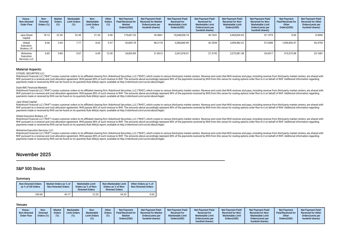 Venue - Non-directed Order Flow Non- Directed Orders (%) Market Orders (%) Marketable Limit Orders (%) Non- Marketable Limit Orders (%) Other Orders (%) Net Payment Paid/Received for Market Orders(USD) Net Payment Paid/ Received for Market Orders(cents per hundred shares) Net Payment Paid/ Received for Marketable Limit Orders(USD) Net Payment Paid/ Received for Marketable Limit Orders(cents per hundred shares) Net Payment Paid/ Received for Non- Marketable Limit Orders(USD) Net Payment Paid/ Received for Non- Marketable Limit Orders(cents per hundred shares) Net Payment Paid/Received for Other Orders(USD) Net Payment Paid/ Received for Other Orders(cents per hundred shares) Jane Street Capital 18.12 22.55 22.49 21.26 0.00 179,607.25 35.4841 10,048,028.74 45.7651 9,405,830.65 57.1979 0.00 0.0000 Global Execution Brokers, LP 8.46 3.94 7.77 8.62 9.37 42,855.78 48.2170 4,286,869.99 42.2544 3,459,482.22 57.6589 1,054,493.47 45.4755 Wolverine Execution Services, LLC 6.83 5.84 5.07 6.09 12.30 24,829.89 21.8212 2,541,878.07 27.2192 2,273,581.38 34.6017 915,375.98 23.1687 Material Aspects: CITADEL SECURITIES LLC: Robinhood Financial LLC (“RHF”) routes customer orders to its affiliated clearing firm, Robinhood Securities, LLC (“RHS”), which routes to various third-party market centers. Revenue and costs that RHS receives and pays, including revenue from third-party market centers, are shared with RHF pursuant to a revenue and cost allocation agreement. RHS passes 80% of such revenue to RHF. The amounts above accordingly represent 80% of the payments received by RHS from this venue for routing options order flow to it on behalf of RHF. Additional information regarding payments made or received by RHS can be found on its quarterly Rule 606(a) report, available at http://robinhood.com/us/en/about/legal/. Dash/IMC Financial Markets: Robinhood Financial LLC (“RHF”) routes customer orders to its affiliated clearing firm, Robinhood Securities, LLC (“RHS”), which routes to various third-party market centers. Revenue and costs that RHS receives and pays, including revenue from third-party market centers, are shared with RHF pursuant to a revenue and cost allocation agreement. RHS passes 80% of such revenue to RHF. The amounts above accordingly represent 80% of the payments received by RHS from this venue for routing options order flow to it on behalf of RHF. Additional information regarding payments made or received by RHS can be found on its quarterly Rule 606(a) report, available at http://robinhood.com/us/en/about/legal/. Jane Street Capital: Robinhood Financial LLC (“RHF”) routes customer orders to its affiliated clearing firm, Robinhood Securities, LLC (“RHS”), which routes to various third-party market centers. Revenue and costs that RHS receives and pays, including revenue from third-party market centers, are shared with RHF pursuant to a revenue and cost allocation agreement. RHS passes 80% of such revenue to RHF. The amounts above accordingly represent 80% of the payments received by RHS from this venue for routing options order flow to it on behalf of RHF. Additional information regarding payments made or received by RHS can be found on its quarterly Rule 606(a) report, available at http://robinhood.com/us/en/about/legal/. Global Execution Brokers, LP: Robinhood Financial LLC (“RHF”) routes customer orders to its affiliated clearing firm, Robinhood Securities, LLC (“RHS”), which routes to various third-party market centers. Revenue and costs that RHS receives and pays, including revenue from third-party market centers, are shared with RHF pursuant to a revenue and cost allocation agreement. RHS passes 80% of such revenue to RHF. The amounts above accordingly represent 80% of the payments received by RHS from this venue for routing options order flow to it on behalf of RHF. Additional information regarding payments made or received by RHS can be found on its quarterly Rule 606(a) report, available at http://robinhood.com/us/en/about/legal/. Wolverine Execution Services, LLC: Robinhood Financial LLC (“RHF”) routes customer orders to its affiliated clearing firm, Robinhood Securities, LLC (“RHS”), which routes to various third-party market centers. Revenue and costs that RHS receives and pays, including revenue from third-party market centers, are shared with RHF pursuant to a revenue and cost allocation agreement. RHS passes 80% of such revenue to RHF. The amounts above accordingly represent 80% of the payments received by RHS from this venue for routing options order flow to it on behalf of RHF. Additional information regarding payments made or received by RHS can be found on its quarterly Rule 606(a) report, available at http://robinhood.com/us/en/about/legal/. November 2025 S&P 500 Stocks Summary Non-Directed Orders as % of All Orders Market Orders as % of Non-Directed Orders Marketable Limit Orders as % of Non- Directed Orders Non-Marketable Limit Orders as % of Non- Directed Orders Other Orders as % of Non-Directed Orders 100.00 43.77 12.25 34.33 9.65 Venues Venue - Non-directed Order Flow Non- Directed Orders (%) Market Orders (%) Marketable Limit Orders (%) Non- Marketable Limit Orders (%) Other Orders (%) Net Payment Paid/Received for Market Orders(USD) Net Payment Paid/ Received for Market Orders(cents per hundred shares) Net Payment Paid/ Received for Marketable Limit Orders(USD) Net Payment Paid/ Received for Marketable Limit Orders(cents per hundred shares) Net Payment Paid/ Received for Non- Marketable Limit Orders(USD) Net Payment Paid/ Received for Non- Marketable Limit Orders(cents per hundred shares) Net Payment Paid/Received for Other Orders(USD) Net Payment Paid/ Received for Other Orders(cents per hundred shares)