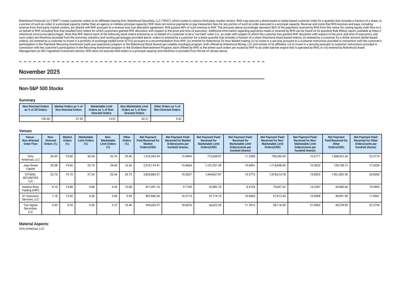 Robinhood Financial LLC (“RHF”) routes customer orders to its affiliated clearing firm, Robinhood Securities, LLC (“RHS”), which routes to various third-party market centers. RHS may execute a share-based or dollar-based customer order for a quantity that includes a fraction of a share, or a portion of such an order, in a principal capacity (rather than an agency or riskless principal capacity); RHF does not receive payments or pay transaction fees for any portion of such an order executed in a principal capacity. Revenue and costs that RHS receives and pays, including revenue from third-party market centers, are shared with RHF pursuant to a revenue and cost allocation agreement. RHS passes 80% of such revenue to RHF. The amounts above accordingly represent 80% of the payments received by RHS from this venue for routing equity order flow to it on behalf of RHF, including flow that resulted from orders for which customers granted RHF discretion with respect to the price and time of execution. Additional information regarding payments made or received by RHS can be found on its quarterly Rule 606(a) report, available at https:// robinhood.com/us/en/about/legal/. Note that RHF deems each of the following stock orders entered by or on behalf of a customer to be a “not held” order (i.e., an order with respect to which the customer has granted RHF discretion with respect to the price and time of execution), and such orders are therefore excluded from the summary statistics and routing percentages provided above: orders (i) entered by a customer for a share quantity that includes a fraction of a share (fractional share-based orders); (ii) entered by a customer for a dollar amount (dollar-based orders); (iii) entered by a customer to invest in a portfolio of exchange traded funds (ETFs) pursuant to a recommendation from RHF; (iv) entered for Robinhood 24 Hour Market trading; (v) to invest in a security pursuant to a customer instruction provided in connection with the customer’s participation in the Paycheck Recurring Investment (split-your-paycheck) program or the Robinhood Stock Round-ups (weekly roundups) program, both offered by Robinhood Money, LLC and certain of its affiliates; (vi) to invest in a security pursuant to customer instructions provided in connection with the customer’s participation in the Recurring Investment program or the Dividend Reinvestment Program, each offered by RHF, to the extent such orders are routed by RHF to an order batcher engine that is operated by RHS; or (vii) entered by Robinhood Asset Management, an SEC-registered investment advisor. RHS does not execute held orders in a principal capacity and therefore is excluded from the list of venues above. November 2025 Non-S&P 500 Stocks Summary Non-Directed Orders as % of All Orders Market Orders as % of Non-Directed Orders Marketable Limit Orders as % of Non- Directed Orders Non-Marketable Limit Orders as % of Non- Directed Orders Other Orders as % of Non-Directed Orders 100.00 37.55 14.81 42.21 5.42 Venues Venue - Non-directed Order Flow Non- Directed Orders (%) Market Orders (%) Marketable Limit Orders (%) Non- Marketable Limit Orders (%) Other Orders (%) Net Payment Paid/Received for Market Orders(USD) Net Payment Paid/ Received for Market Orders(cents per hundred shares) Net Payment Paid/ Received for Marketable Limit Orders(USD) Net Payment Paid/ Received for Marketable Limit Orders(cents per hundred shares) Net Payment Paid/ Received for Non- Marketable Limit Orders(USD) Net Payment Paid/ Received for Non- Marketable Limit Orders(cents per hundred shares) Net Payment Paid/Received for Other Orders(USD) Net Payment Paid/ Received for Other Orders(cents per hundred shares) Virtu Americas, LLC 30.49 23.80 38.54 33.76 29.40 1,516,365.93 15.0894 772,668.87 11.2386 750,240.69 12.6771 1,588,422.26 22.5774 Jane Street Capital 25.08 19.60 32.16 28.60 16.34 2,310,119.41 13.4664 1,101,251.99 10.6091 1,118,698.05 12.3932 128,198.13 17.6204 CITADEL SECURITIES LLC 23.75 19.10 27.24 26.54 24.73 2,834,884.31 15.3637 1,444,667.87 14.3772 1,378,614.78 15.8522 1,961,692.50 24.8392 Hudson River Trading (HRT) 8.10 14.88 0.86 4.34 10.08 817,491.16 9.7100 32,982.75 8.2103 70,697.22 14.2287 36,080.66 10.9905 G1 Execution Services, LLC 7.18 13.42 0.68 3.66 9.05 807,846.26 16.3114 47,714.15 10.4682 67,013.44 16.0008 40,091.00 17.8561 Two Sigma Securities, LLC 5.40 9.20 0.52 3.10 10.40 694,425.57 18.0076 26,622.50 11.7812 56,118.09 21.0062 45,378.85 22.3754 Material Aspects: Virtu Americas, LLC: