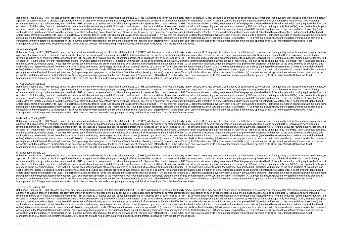Robinhood Financial LLC (“RHF”) routes customer orders to its affiliated clearing firm, Robinhood Securities, LLC (“RHS”), which routes to various third-party market centers. RHS may execute a share-based or dollar-based customer order for a quantity that includes a fraction of a share, or a portion of such an order, in a principal capacity (rather than an agency or riskless principal capacity); RHF does not receive payments or pay transaction fees for any portion of such an order executed in a principal capacity. Revenue and costs that RHS receives and pays, including revenue from third-party market centers, are shared with RHF pursuant to a revenue and cost allocation agreement. RHS passes 80% of such revenue to RHF. The amounts above accordingly represent 80% of the payments received by RHS from this venue for routing equity order flow to it on behalf of RHF, including flow that resulted from orders for which customers granted RHF discretion with respect to the price and time of execution. Additional information regarding payments made or received by RHS can be found on its quarterly Rule 606(a) report, available at https:// robinhood.com/us/en/about/legal/. Note that RHF deems each of the following stock orders entered by or on behalf of a customer to be a “not held” order (i.e., an order with respect to which the customer has granted RHF discretion with respect to the price and time of execution), and such orders are therefore excluded from the summary statistics and routing percentages provided above: orders (i) entered by a customer for a share quantity that includes a fraction of a share (fractional share-based orders); (ii) entered by a customer for a dollar amount (dollar-based orders); (iii) entered by a customer to invest in a portfolio of exchange traded funds (ETFs) pursuant to a recommendation from RHF; (iv) entered for Robinhood 24 Hour Market trading; (v) to invest in a security pursuant to a customer instruction provided in connection with the customer’s participation in the Paycheck Recurring Investment (split-your-paycheck) program or the Robinhood Stock Round-ups (weekly roundups) program, both offered by Robinhood Money, LLC and certain of its affiliates; (vi) to invest in a security pursuant to customer instructions provided in connection with the customer’s participation in the Recurring Investment program or the Dividend Reinvestment Program, each offered by RHF, to the extent such orders are routed by RHF to an order batcher engine that is operated by RHS; or (vii) entered by Robinhood Asset Management, an SEC-registered investment advisor. RHS does not execute held orders in a principal capacity and therefore is excluded from the list of venues above. Jane Street Capital: Robinhood Financial LLC (“RHF”) routes customer orders to its affiliated clearing firm, Robinhood Securities, LLC (“RHS”), which routes to various third-party market centers. RHS may execute a share-based or dollar-based customer order for a quantity that includes a fraction of a share, or a portion of such an order, in a principal capacity (rather than an agency or riskless principal capacity); RHF does not receive payments or pay transaction fees for any portion of such an order executed in a principal capacity. Revenue and costs that RHS receives and pays, including revenue from third-party market centers, are shared with RHF pursuant to a revenue and cost allocation agreement. RHS passes 80% of such revenue to RHF. The amounts above accordingly represent 80% of the payments received by RHS from this venue for routing equity order flow to it on behalf of RHF, including flow that resulted from orders for which customers granted RHF discretion with respect to the price and time of execution. Additional information regarding payments made or received by RHS can be found on its quarterly Rule 606(a) report, available at https:// robinhood.com/us/en/about/legal/. Note that RHF deems each of the following stock orders entered by or on behalf of a customer to be a “not held” order (i.e., an order with respect to which the customer has granted RHF discretion with respect to the price and time of execution), and such orders are therefore excluded from the summary statistics and routing percentages provided above: orders (i) entered by a customer for a share quantity that includes a fraction of a share (fractional share-based orders); (ii) entered by a customer for a dollar amount (dollar-based orders); (iii) entered by a customer to invest in a portfolio of exchange traded funds (ETFs) pursuant to a recommendation from RHF; (iv) entered for Robinhood 24 Hour Market trading; (v) to invest in a security pursuant to a customer instruction provided in connection with the customer’s participation in the Paycheck Recurring Investment (split-your-paycheck) program or the Robinhood Stock Round-ups (weekly roundups) program, both offered by Robinhood Money, LLC and certain of its affiliates; (vi) to invest in a security pursuant to customer instructions provided in connection with the customer’s participation in the Recurring Investment program or the Dividend Reinvestment Program, each offered by RHF, to the extent such orders are routed by RHF to an order batcher engine that is operated by RHS; or (vii) entered by Robinhood Asset Management, an SEC-registered investment advisor. RHS does not execute held orders in a principal capacity and therefore is excluded from the list of venues above. CITADEL SECURITIES LLC: Robinhood Financial LLC (“RHF”) routes customer orders to its affiliated clearing firm, Robinhood Securities, LLC (“RHS”), which routes to various third-party market centers. RHS may execute a share-based or dollar-based customer order for a quantity that includes a fraction of a share, or a portion of such an order, in a principal capacity (rather than an agency or riskless principal capacity); RHF does not receive payments or pay transaction fees for any 