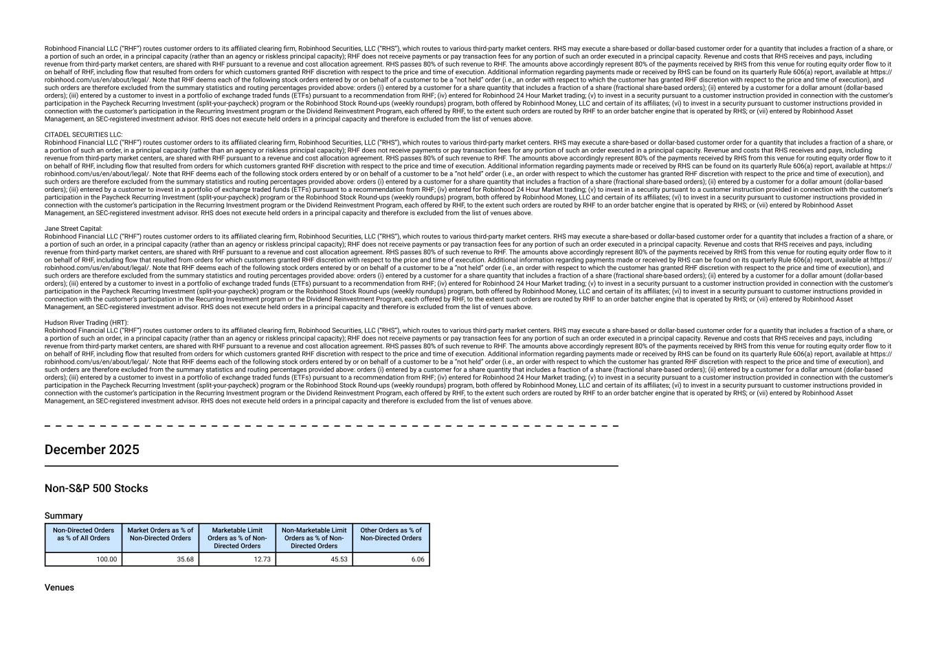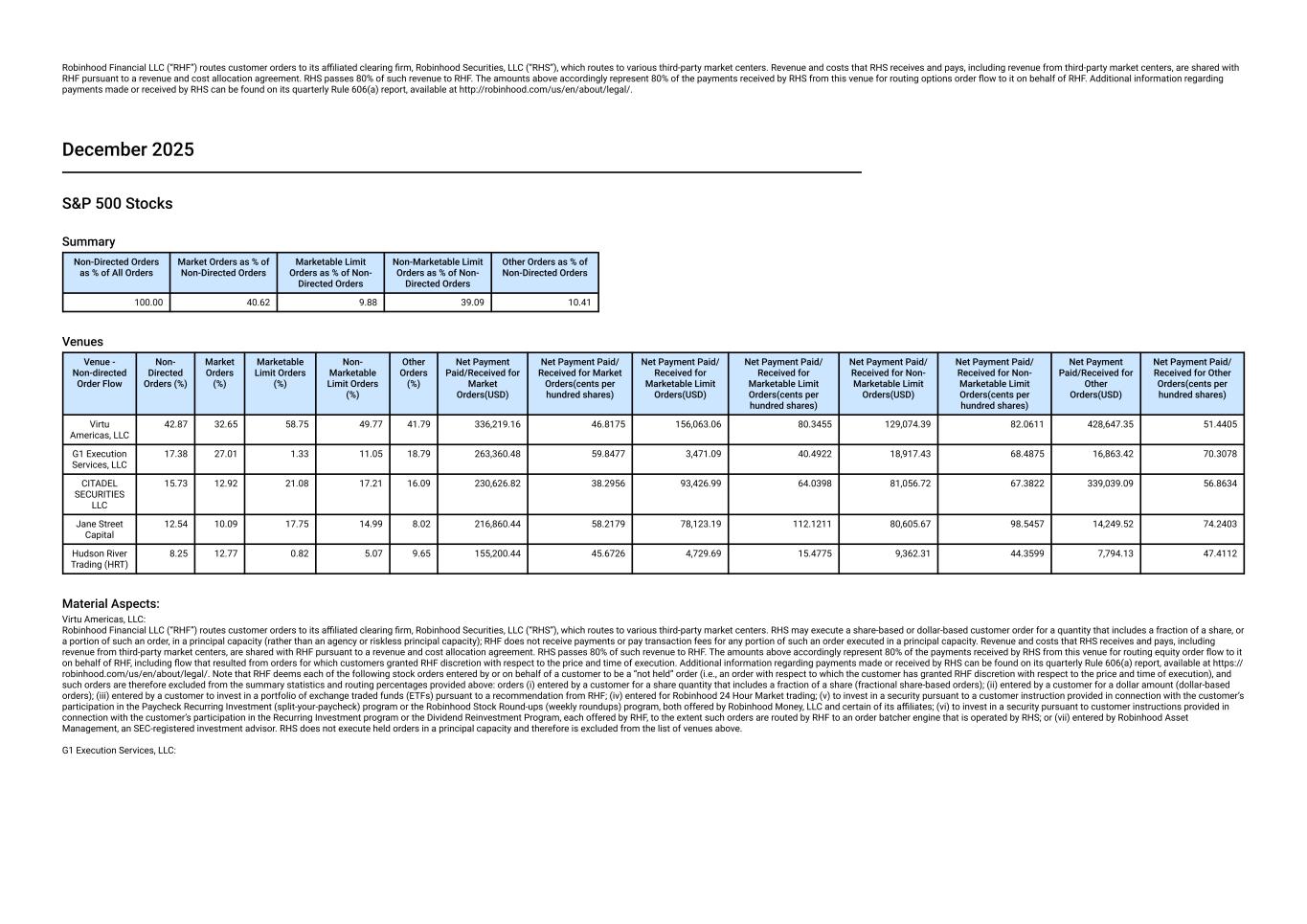 Robinhood Financial LLC (“RHF”) routes customer orders to its affiliated clearing firm, Robinhood Securities, LLC (“RHS”), which routes to various third-party market centers. Revenue and costs that RHS receives and pays, including revenue from third-party market centers, are shared with RHF pursuant to a revenue and cost allocation agreement. RHS passes 80% of such revenue to RHF. The amounts above accordingly represent 80% of the payments received by RHS from this venue for routing options order flow to it on behalf of RHF. Additional information regarding payments made or received by RHS can be found on its quarterly Rule 606(a) report, available at http://robinhood.com/us/en/about/legal/. December 2025 S&P 500 Stocks Summary Non-Directed Orders as % of All Orders Market Orders as % of Non-Directed Orders Marketable Limit Orders as % of Non- Directed Orders Non-Marketable Limit Orders as % of Non- Directed Orders Other Orders as % of Non-Directed Orders 100.00 40.62 9.88 39.09 10.41 Venues Venue - Non-directed Order Flow Non- Directed Orders (%) Market Orders (%) Marketable Limit Orders (%) Non- Marketable Limit Orders (%) Other Orders (%) Net Payment Paid/Received for Market Orders(USD) Net Payment Paid/ Received for Market Orders(cents per hundred shares) Net Payment Paid/ Received for Marketable Limit Orders(USD) Net Payment Paid/ Received for Marketable Limit Orders(cents per hundred shares) Net Payment Paid/ Received for Non- Marketable Limit Orders(USD) Net Payment Paid/ Received for Non- Marketable Limit Orders(cents per hundred shares) Net Payment Paid/Received for Other Orders(USD) Net Payment Paid/ Received for Other Orders(cents per hundred shares) Virtu Americas, LLC 42.87 32.65 58.75 49.77 41.79 336,219.16 46.8175 156,063.06 80.3455 129,074.39 82.0611 428,647.35 51.4405 G1 Execution Services, LLC 17.38 27.01 1.33 11.05 18.79 263,360.48 59.8477 3,471.09 40.4922 18,917.43 68.4875 16,863.42 70.3078 CITADEL SECURITIES LLC 15.73 12.92 21.08 17.21 16.09 230,626.82 38.2956 93,426.99 64.0398 81,056.72 67.3822 339,039.09 56.8634 Jane Street Capital 12.54 10.09 17.75 14.99 8.02 216,860.44 58.2179 78,123.19 112.1211 80,605.67 98.5457 14,249.52 74.2403 Hudson River Trading (HRT) 8.25 12.77 0.82 5.07 9.65 155,200.44 45.6726 4,729.69 15.4775 9,362.31 44.3599 7,794.13 47.4112 Material Aspects: Virtu Americas, LLC: Robinhood Financial LLC (“RHF”) routes customer orders to its affiliated clearing firm, Robinhood Securities, LLC (“RHS”), which routes to various third-party market centers. RHS may execute a share-based or dollar-based customer order for a quantity that includes a fraction of a share, or a portion of such an order, in a principal capacity (rather than an agency or riskless principal capacity); RHF does not receive payments or pay transaction fees for any portion of such an order executed in a principal capacity. Revenue and costs that RHS receives and pays, including revenue from third-party market centers, are shared with RHF pursuant to a revenue and cost allocation agreement. RHS passes 80% of such revenue to RHF. The amounts above accordingly represent 80% of the payments received by RHS from this venue for routing equity order flow to it on behalf of RHF, including flow that resulted from orders for which customers granted RHF discretion with respect to the price and time of execution. Additional information regarding payments made or received by RHS can be found on its quarterly Rule 606(a) report, available at https:// robinhood.com/us/en/about/legal/. Note that RHF deems each of the following stock orders entered by or on behalf of a customer to be a “not held” order (i.e., an order with respect to which the customer has granted RHF discretion with respect to the price and time of execution), and such orders are therefore excluded from the summary statistics and routing percentages provided above: orders (i) entered by a customer for a share quantity that includes a fraction of a share (fractional share-based orders); (ii) entered by a customer for a dollar amount (dollar-based orders); (iii) entered by a customer to invest in a portfolio of exchange traded funds (ETFs) pursuant to a recommendation from RHF; (iv) entered for Robinhood 24 Hour Market trading; (v) to invest in a security pursuant to a customer instruction provided in connection with the customer’s participation in the Paycheck Recurring Investment (split-your-paycheck) program or the Robinhood Stock Round-ups (weekly roundups) program, both offered by Robinhood Money, LLC and certain of its affiliates; (vi) to invest in a security pursuant to customer instructions provided in connection with the customer’s participation in the Recurring Investment program or the Dividend Reinvestment Program, each offered by RHF, to the extent such orders are routed by RHF to an order batcher engine that is operated by RHS; or (vii) entered by Robinhood Asset Management, an SEC-registered investment advisor. RHS does not execute held orders in a principal capacity and therefore is excluded from the list of venues above. G1 Execution Services, LLC: