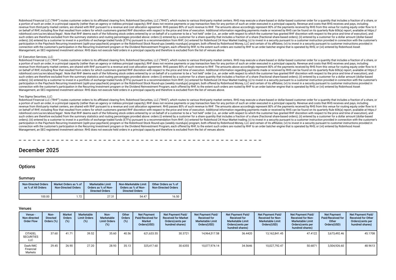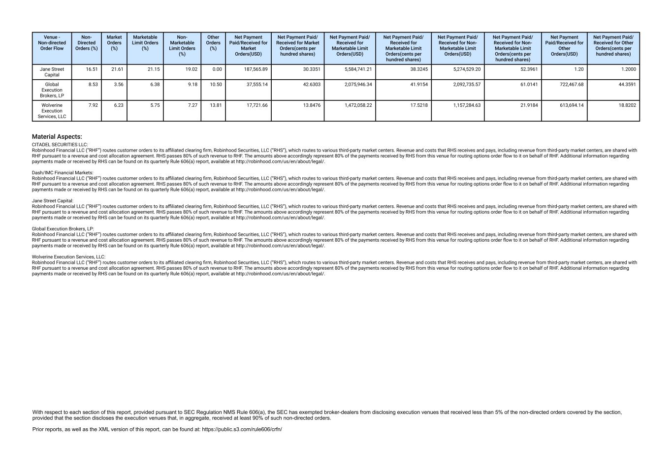 Venue - Non-directed Order Flow Non- Directed Orders (%) Market Orders (%) Marketable Limit Orders (%) Non- Marketable Limit Orders (%) Other Orders (%) Net Payment Paid/Received for Market Orders(USD) Net Payment Paid/ Received for Market Orders(cents per hundred shares) Net Payment Paid/ Received for Marketable Limit Orders(USD) Net Payment Paid/ Received for Marketable Limit Orders(cents per hundred shares) Net Payment Paid/ Received for Non- Marketable Limit Orders(USD) Net Payment Paid/ Received for Non- Marketable Limit Orders(cents per hundred shares) Net Payment Paid/Received for Other Orders(USD) Net Payment Paid/ Received for Other Orders(cents per hundred shares) Jane Street Capital 16.51 21.61 21.15 19.02 0.00 187,565.89 30.3351 5,584,741.21 38.3245 5,274,529.20 52.3961 1.20 1.2000 Global Execution Brokers, LP 8.53 3.56 6.38 9.18 10.50 37,555.14 42.6303 2,075,946.34 41.9154 2,092,735.57 61.0141 722,467.68 44.3591 Wolverine Execution Services, LLC 7.92 6.23 5.75 7.27 13.81 17,721.66 13.8476 1,472,058.22 17.5218 1,157,284.63 21.9184 613,694.14 18.8202 Material Aspects: CITADEL SECURITIES LLC: Robinhood Financial LLC (“RHF”) routes customer orders to its affiliated clearing firm, Robinhood Securities, LLC (“RHS”), which routes to various third-party market centers. Revenue and costs that RHS receives and pays, including revenue from third-party market centers, are shared with RHF pursuant to a revenue and cost allocation agreement. RHS passes 80% of such revenue to RHF. The amounts above accordingly represent 80% of the payments received by RHS from this venue for routing options order flow to it on behalf of RHF. Additional information regarding payments made or received by RHS can be found on its quarterly Rule 606(a) report, available at http://robinhood.com/us/en/about/legal/. Dash/IMC Financial Markets: Robinhood Financial LLC (“RHF”) routes customer orders to its affiliated clearing firm, Robinhood Securities, LLC (“RHS”), which routes to various third-party market centers. Revenue and costs that RHS receives and pays, including revenue from third-party market centers, are shared with RHF pursuant to a revenue and cost allocation agreement. RHS passes 80% of such revenue to RHF. The amounts above accordingly represent 80% of the payments received by RHS from this venue for routing options order flow to it on behalf of RHF. Additional information regarding payments made or received by RHS can be found on its quarterly Rule 606(a) report, available at http://robinhood.com/us/en/about/legal/. Jane Street Capital: Robinhood Financial LLC (“RHF”) routes customer orders to its affiliated clearing firm, Robinhood Securities, LLC (“RHS”), which routes to various third-party market centers. Revenue and costs that RHS receives and pays, including revenue from third-party market centers, are shared with RHF pursuant to a revenue and cost allocation agreement. RHS passes 80% of such revenue to RHF. The amounts above accordingly represent 80% of the payments received by RHS from this venue for routing options order flow to it on behalf of RHF. Additional information regarding payments made or received by RHS can be found on its quarterly Rule 606(a) report, available at http://robinhood.com/us/en/about/legal/. Global Execution Brokers, LP: Robinhood Financial LLC (“RHF”) routes customer orders to its affiliated clearing firm, Robinhood Securities, LLC (“RHS”), which routes to various third-party market centers. Revenue and costs that RHS receives and pays, including revenue from third-party market centers, are shared with RHF pursuant to a revenue and cost allocation agreement. RHS passes 80% of such revenue to RHF. The amounts above accordingly represent 80% of the payments received by RHS from this venue for routing options order flow to it on behalf of RHF. Additional information regarding payments made or received by RHS can be found on its quarterly Rule 606(a) report, available at http://robinhood.com/us/en/about/legal/. Wolverine Execution Services, LLC: Robinhood Financial LLC (“RHF”) routes customer orders to its affiliated clearing firm, Robinhood Securities, LLC (“RHS”), which routes to various third-party market centers. Revenue and costs that RHS receives and pays, including revenue from third-party market centers, are shared with RHF pursuant to a revenue and cost allocation agreement. RHS passes 80% of such revenue to RHF. The amounts above accordingly represent 80% of the payments received by RHS from this venue for routing options order flow to it on behalf of RHF. Additional information regarding payments made or received by RHS can be found on its quarterly Rule 606(a) report, available at http://robinhood.com/us/en/about/legal/.
