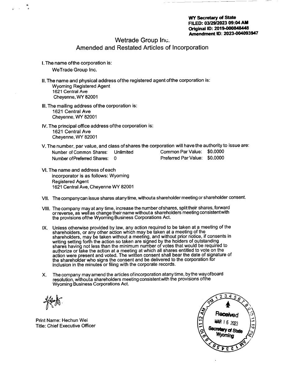 EX-3.1 2 wetg_ex31.htm AMENDED AND RESTATED ARTICLES OF INCORPORATION wetg_ex31.htm