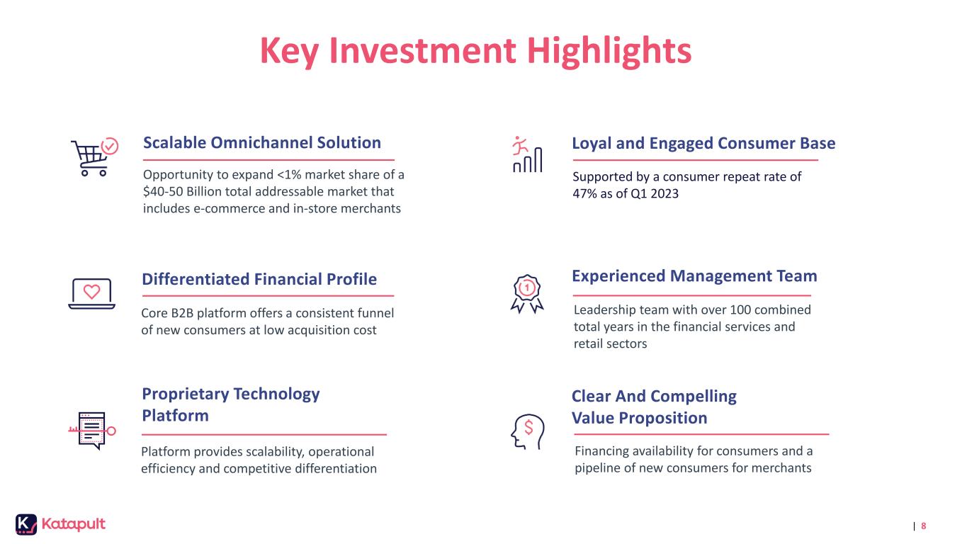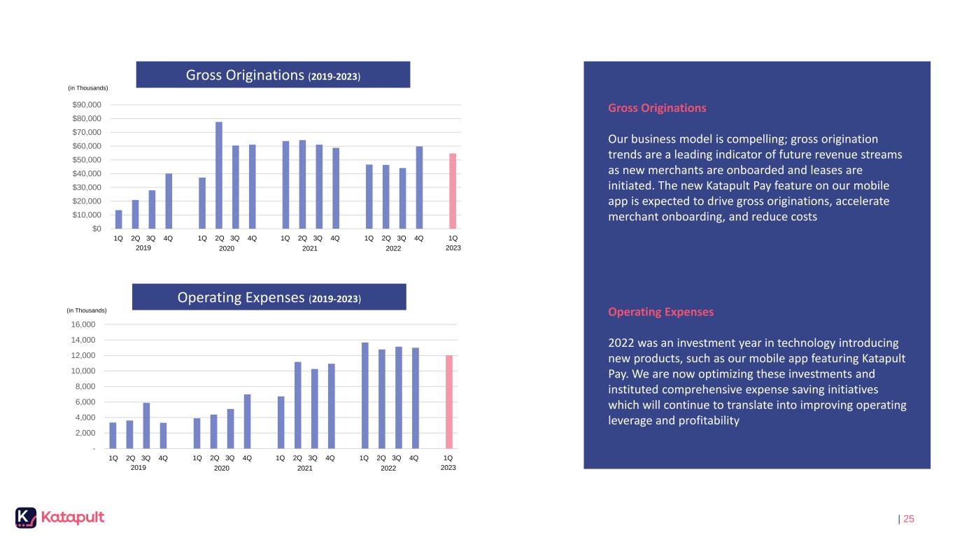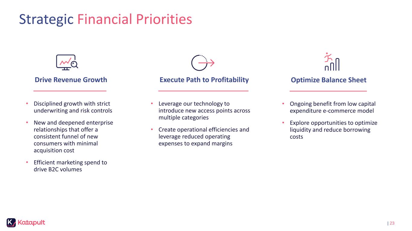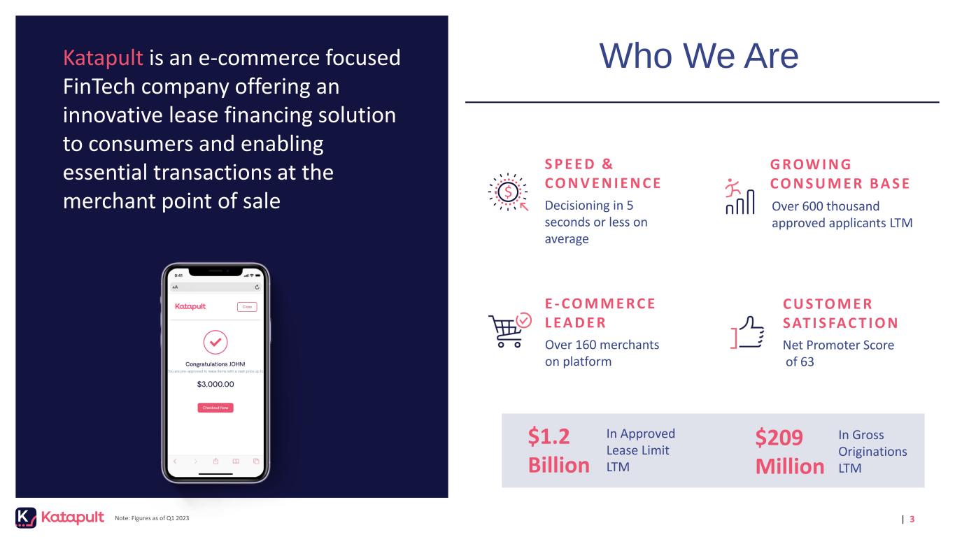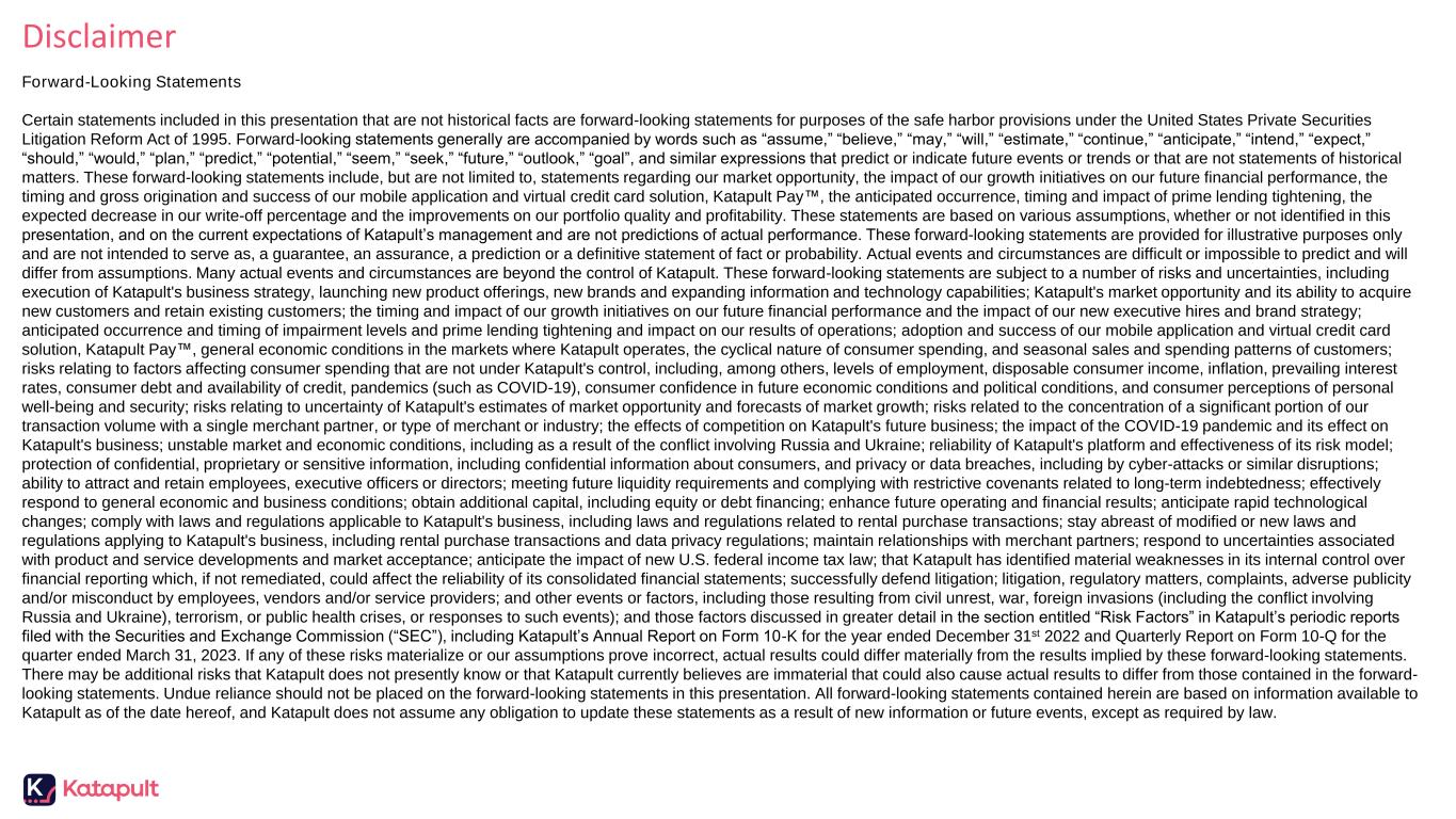 Disclaimer Forward-Looking Statements Certain statements included in this presentation that are not historical facts are forward-looking statements for purposes of the safe harbor provisions under the United States Private Securities Litigation Reform Act of 1995. Forward-looking statements generally are accompanied by words such as “assume,” “believe,” “may,” “will,” “estimate,” “continue,” “anticipate,” “intend,” “expect,” “should,” “would,” “plan,” “predict,” “potential,” “seem,” “seek,” “future,” “outlook,” “goal”, and similar expressions that predict or indicate future events or trends or that are not statements of historical matters. These forward-looking statements include, but are not limited to, statements regarding our market opportunity, the impact of our growth initiatives on our future financial performance, the timing and gross origination and success of our mobile application and virtual credit card solution, Katapult Pay™, the anticipated occurrence, timing and impact of prime lending tightening, the expected decrease in our write-off percentage and the improvements on our portfolio quality and profitability. These statements are based on various assumptions, whether or not identified in this presentation, and on the current expectations of Katapult’s management and are not predictions of actual performance. These forward-looking statements are provided for illustrative purposes only and are not intended to serve as, a guarantee, an assurance, a prediction or a definitive statement of fact or probability. Actual events and circumstances are difficult or impossible to predict and will differ from assumptions. Many actual events and circumstances are beyond the control of Katapult. These forward-looking statements are subject to a number of risks and uncertainties, including execution of Katapult's business strategy, launching new product offerings, new brands and expanding information and technology capabilities; Katapult's market opportunity and its ability to acquire new customers and retain existing customers; the timing and impact of our growth initiatives on our future financial performance and the impact of our new executive hires and brand strategy; anticipated occurrence and timing of impairment levels and prime lending tightening and impact on our results of operations; adoption and success of our mobile application and virtual credit card solution, Katapult Pay™, general economic conditions in the markets where Katapult operates, the cyclical nature of consumer spending, and seasonal sales and spending patterns of customers; risks relating to factors affecting consumer spending that are not under Katapult's control, including, among others, levels of employment, disposable consumer income, inflation, prevailing interest rates, consumer debt and availability of credit, pandemics (such as COVID-19), consumer confidence in future economic conditions and political conditions, and consumer perceptions of personal well-being and security; risks relating to uncertainty of Katapult's estimates of market opportunity and forecasts of market growth; risks related to the concentration of a significant portion of our transaction volume with a single merchant partner, or type of merchant or industry; the effects of competition on Katapult's future business; the impact of the COVID-19 pandemic and its effect on Katapult's business; unstable market and economic conditions, including as a result of the conflict involving Russia and Ukraine; reliability of Katapult's platform and effectiveness of its risk model; protection of confidential, proprietary or sensitive information, including confidential information about consumers, and privacy or data breaches, including by cyber-attacks or similar disruptions; ability to attract and retain employees, executive officers or directors; meeting future liquidity requirements and complying with restrictive covenants related to long-term indebtedness; effectively respond to general economic and business conditions; obtain additional capital, including equity or debt financing; enhance future operating and financial results; anticipate rapid technological changes; comply with laws and regulations applicable to Katapult's business, including laws and regulations related to rental purchase transactions; stay abreast of modified or new laws and regulations applying to Katapult's business, including rental purchase transactions and data privacy regulations; maintain relationships with merchant partners; respond to uncertainties associated with product and service developments and market acceptance; anticipate the impact of new U.S. federal income tax law; that Katapult has identified material weaknesses in its internal control over financial reporting which, if not remediated, could affect the reliability of its consolidated financial statements; successfully defend litigation; litigation, regulatory matters, complaints, adverse publicity and/or misconduct by employees, vendors and/or service providers; and other events or factors, including those resulting from civil unrest, war, foreign invasions (including the conflict involving Russia and Ukraine), terrorism, or public health crises, or responses to such events); and those factors discussed in greater detail in the section entitled “Risk Factors” in Katapult’s periodic reports filed with the Securities and Exchange Commission (“SEC”), including Katapult’s Annual Report on Form 10-K for the year ended December 31st 2022 and Quarterly Report on Form 10-Q for the quarter ended March 31, 2023. If any of these risks materialize or our assumptions prove incorrect, actual results could differ materially from the results implied by these forward-looking statements. There may be additional risks that Katapult does not presently know or that Katapult currently believes are immaterial that could also cause act