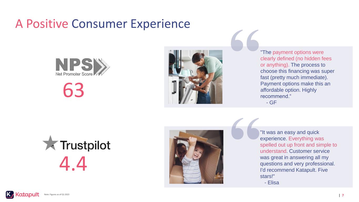 4.4 63 "It was an easy and quick experience. Everything was spelled out up front and simple to understand. Customer service was great in answering all my questions and very professional. I'd recommend Katapult. Five stars!" - Elisa "The payment options were clearly defined (no hidden fees or anything). The process to choose this financing was super fast (pretty much immediate). Payment options make this an affordable option. Highly recommend.“ - GF A Positive Consumer Experience | 7Note: Figures as of Q1 2023
