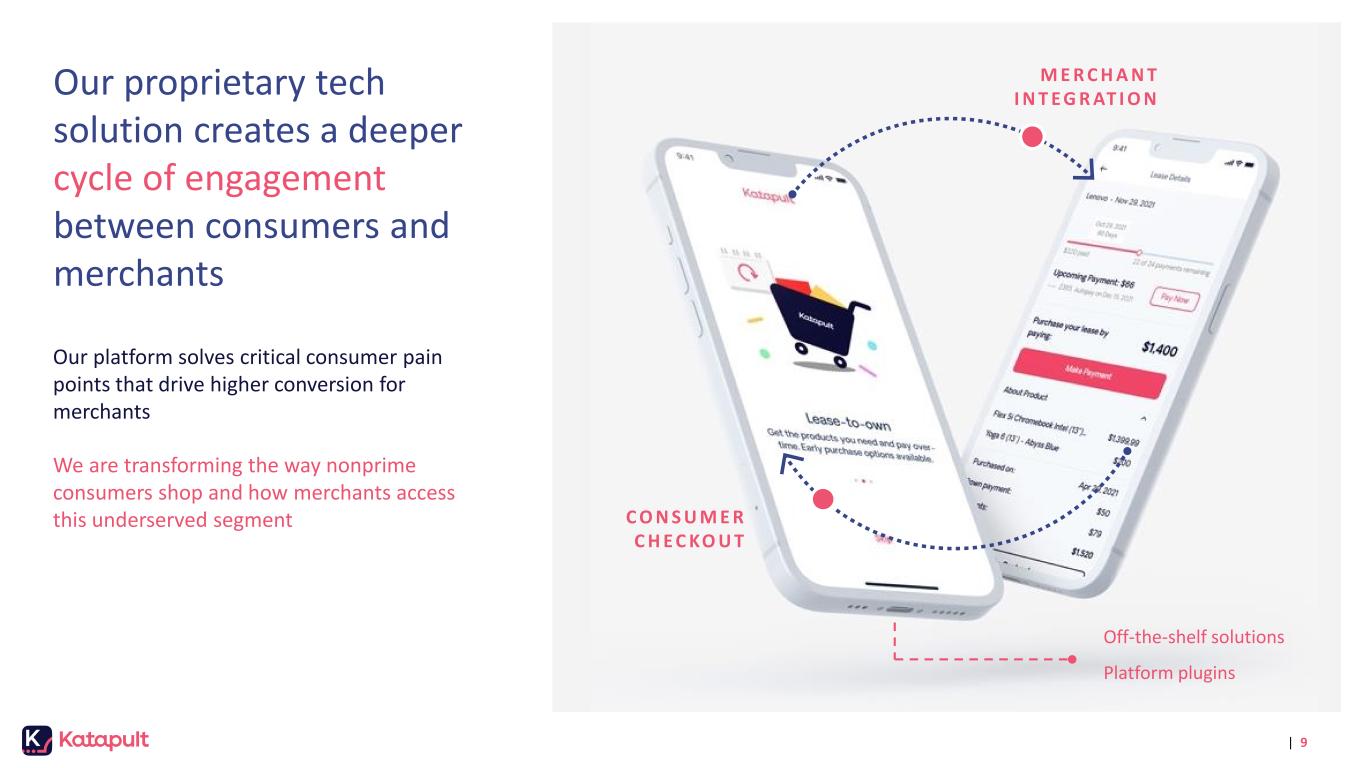 could not cover $400 of emergence expenses without assistance Experienced Management Team Leadership team with over 100 combined total years in the financial services and retail sectors Scalable Omnichannel Solution Opportunity to expand <1% market share of a $40-50 Billion total addressable market that includes e-commerce and in-store merchants Differentiated Financial Profile Core B2B platform offers a consistent funnel of new consumers at low acquisition cost Key Investment Highlights | 8 Loyal and Engaged Consumer Base Supported by a consumer repeat rate of 47% as of Q1 2023 Proprietary Technology Platform Platform provides scalability, operational efficiency and competitive differentiation Clear And Compelling Value Proposition Financing availability for consumers and a pipeline of new consumers for merchants