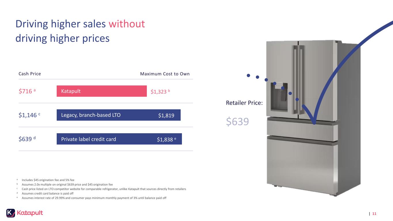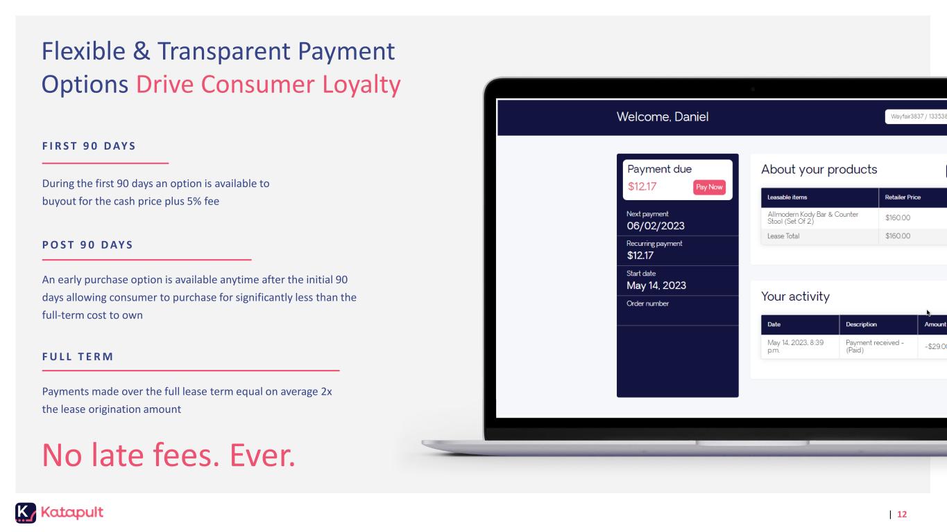a Includes $45 origination fee and 5% fee b Assumes 2.0x multiple on original $639 price and $45 origination fee c Cash price listed on LTO competitor website for comparable refrigerator, unlike Katapult that sources directly from retailers d Assumes credit card balance is paid off e Assumes interest rate of 29.99% and consumer pays minimum monthly payment of 3% until balance paid off $716 a Cash Price Maximum Cost to Own $1,146 c $639 d Katapult $1,323 b Legacy, branch-based LTO $1,819 $1,838 ePrivate label credit card Retailer Price: $639 Driving higher sales without driving higher prices | 11