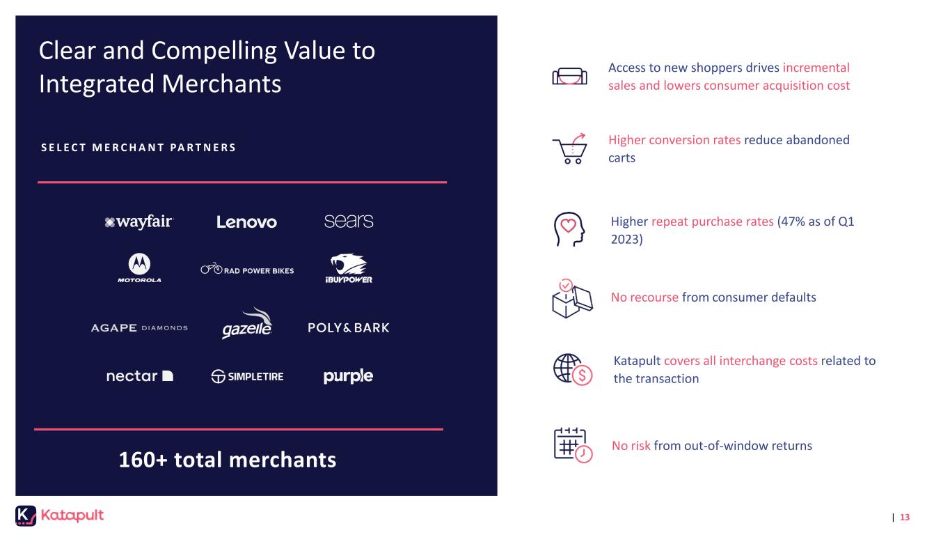 S E L E C T M E R C H A N T PA R T N E R S 160+ total merchants Clear and Compelling Value to Integrated Merchants Access to new shoppers drives incremental sales and lowers consumer acquisition cost Higher repeat purchase rates (47% as of Q1 2023) No recourse from consumer defaults Katapult covers all interchange costs related to the transaction No risk from out-of-window returns Higher conversion rates reduce abandoned carts | 13