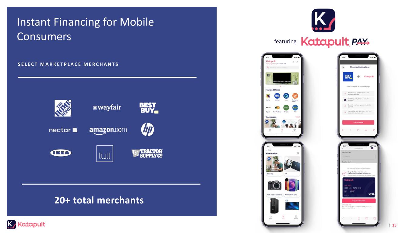 More data, more insight Platform opens Katapult’s ability to engage with consumers in a new way, increasing our retention, repeat rates, and satisfactory ratings Smarter transactions, fast approval AI evaluates carts, shopping behavior, among other characteristics, to determine lease pre-approval limits, populating a one-time use virtual card for completing the transaction Improved accuracy, lower risk Katapult’s mobile app, featuring Katapult Pay technology, allows consumers to seamlessly shop durable goods at a wide range of national merchants Underserved consumers National merchants Katapult Pay is a transformational feature on our mobile app for facilitating lease-purchases and accelerating merchant onboarding | 14 featuring