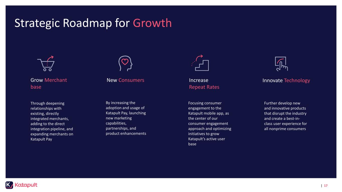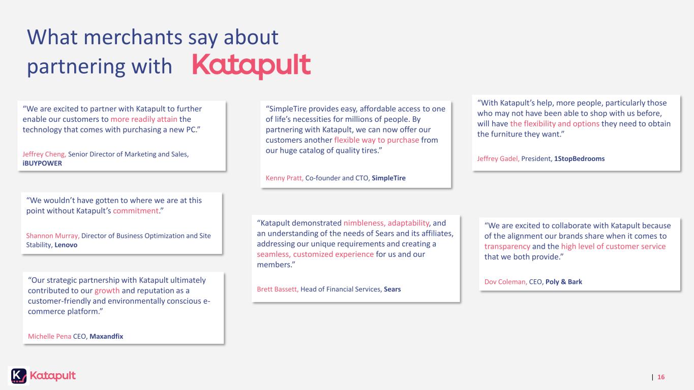 “We are excited to partner with Katapult to further enable our customers to more readily attain the technology that comes with purchasing a new PC.” Jeffrey Cheng, Senior Director of Marketing and Sales, iBUYPOWER “With Katapult’s help, more people, particularly those who may not have been able to shop with us before, will have the flexibility and options they need to obtain the furniture they want.” Jeffrey Gadel, President, 1StopBedrooms “Katapult demonstrated nimbleness, adaptability, and an understanding of the needs of Sears and its affiliates, addressing our unique requirements and creating a seamless, customized experience for us and our members.” Brett Bassett, Head of Financial Services, Sears “We wouldn’t have gotten to where we are at this point without Katapult’s commitment.” Shannon Murray, Director of Business Optimization and Site Stability, Lenovo “We are excited to collaborate with Katapult because of the alignment our brands share when it comes to transparency and the high level of customer service that we both provide.” Dov Coleman, CEO, Poly & Bark“Our strategic partnership with Katapult ultimately contributed to our growth and reputation as a customer-friendly and environmentally conscious e- commerce platform.” Michelle Pena CEO, Maxandfix “SimpleTire provides easy, affordable access to one of life’s necessities for millions of people. By partnering with Katapult, we can now offer our customers another flexible way to purchase from our huge catalog of quality tires.” Kenny Pratt, Co-founder and CTO, SimpleTire What merchants say about partnering with | 16