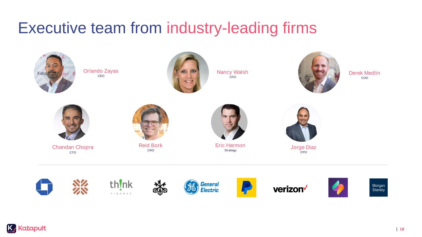Executive team from industry-leading firms Orlando Zayas CEO Nancy Walsh CFO Derek Medlin COO Chandan Chopra CTO Reid Bork CRO Eric Harmon Strategy Jorge Diaz CPO | 18