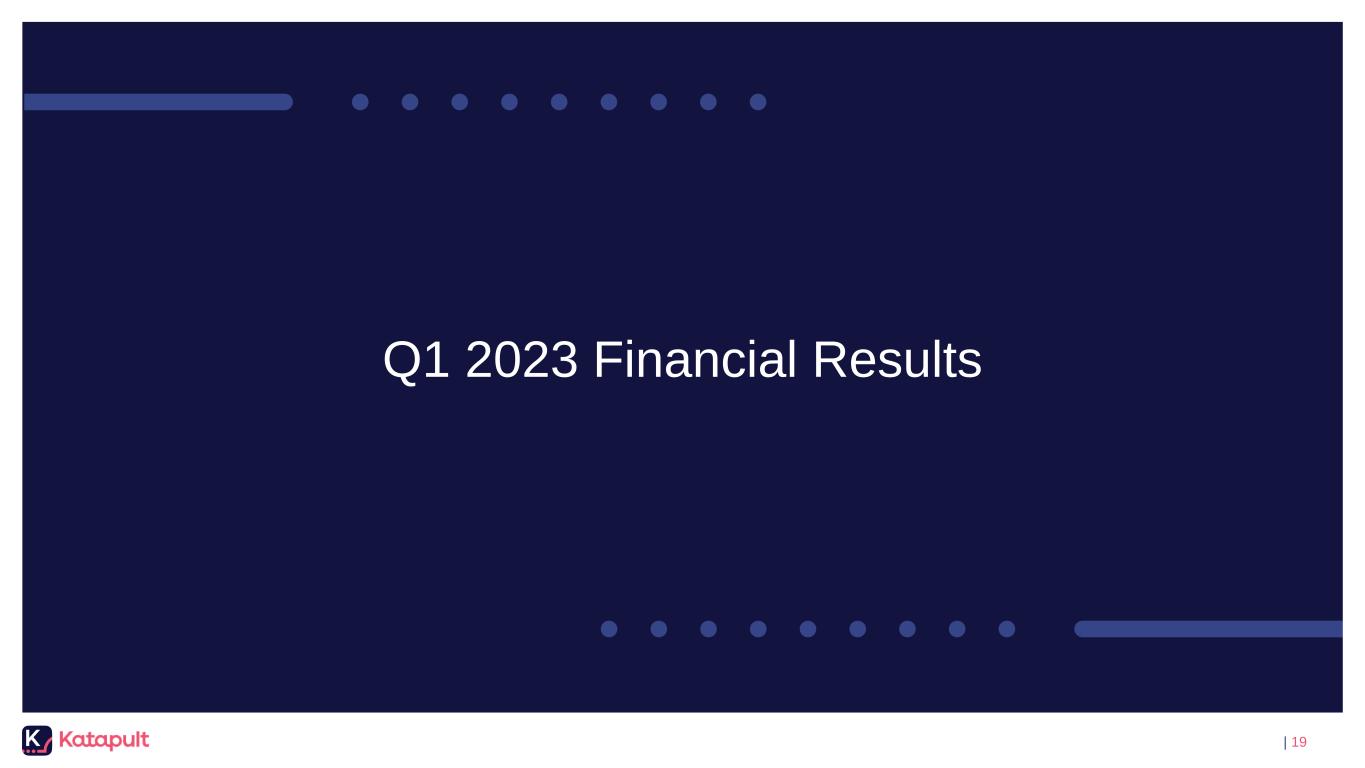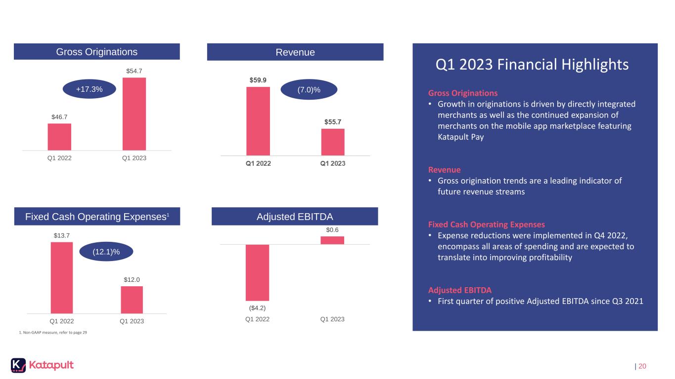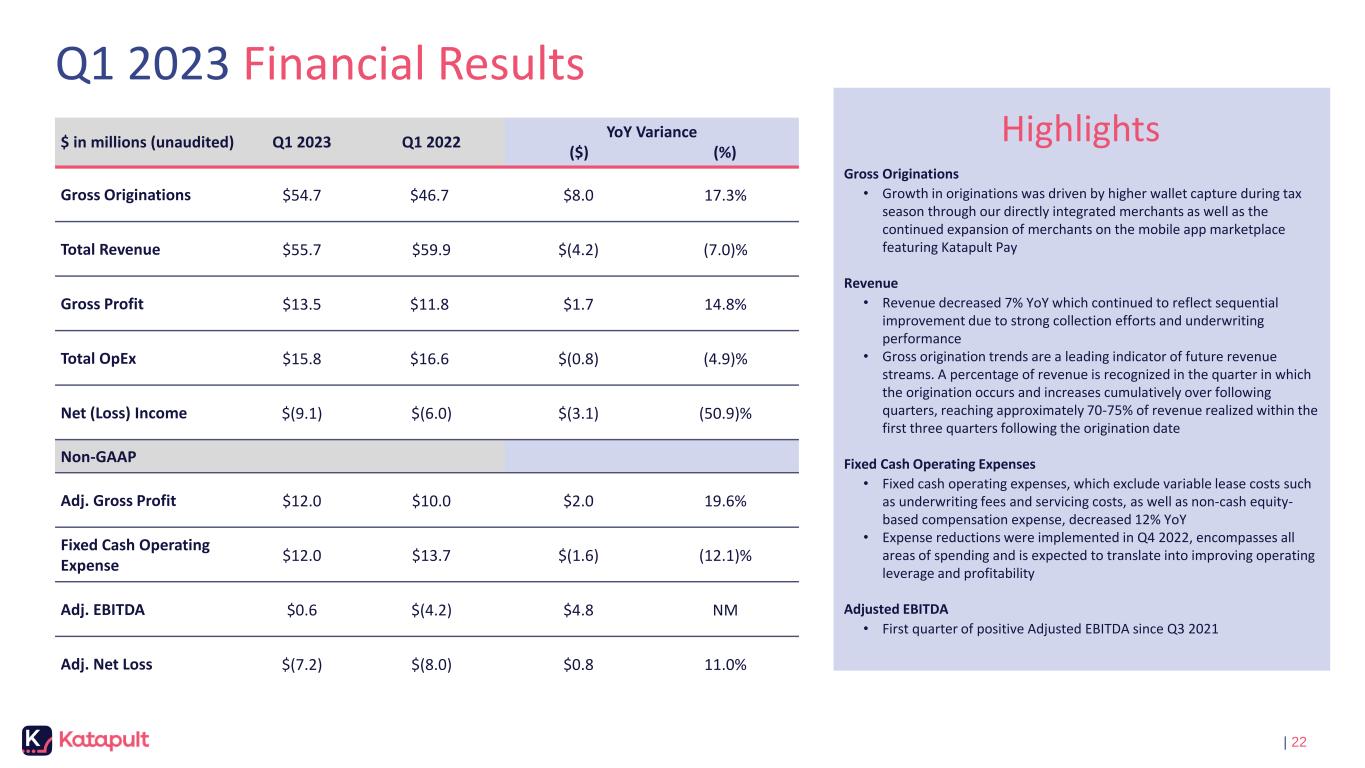 Gross Originations • Growth in originations was driven by higher wallet capture during tax season through our directly integrated merchants as well as the continued expansion of merchants on the mobile app marketplace featuring Katapult Pay Revenue • Revenue decreased 7% YoY which continued to reflect sequential improvement due to strong collection efforts and underwriting performance • Gross origination trends are a leading indicator of future revenue streams. A percentage of revenue is recognized in the quarter in which the origination occurs and increases cumulatively over following quarters, reaching approximately 70-75% of revenue realized within the first three quarters following the origination date Fixed Cash Operating Expenses • Fixed cash operating expenses, which exclude variable lease costs such as underwriting fees and servicing costs, as well as non-cash equity- based compensation expense, decreased 12% YoY • Expense reductions were implemented in Q4 2022, encompasses all areas of spending and is expected to translate into improving operating leverage and profitability Adjusted EBITDA • First quarter of positive Adjusted EBITDA since Q3 2021 Q1 2023 Financial Results $ in millions (unaudited) Q1 2023 Q1 2022 YoY Variance ($) (%) Gross Originations $54.7 $46.7 $8.0 17.3% Total Revenue $55.7 $59.9 $(4.2) (7.0)% Gross Profit $13.5 $11.8 $1.7 14.8% Total OpEx $15.8 $16.6 $(0.8) (4.9)% Net (Loss) Income $(9.1) $(6.0) $(3.1) (50.9)% Non-GAAP Adj. Gross Profit $12.0 $10.0 $2.0 19.6% Fixed Cash Operating Expense $12.0 $13.7 $(1.6) (12.1)% Adj. EBITDA $0.6 $(4.2) $4.8 NM Adj. Net Loss $(7.2) $(8.0) $0.8 11.0% | 22 Highlights