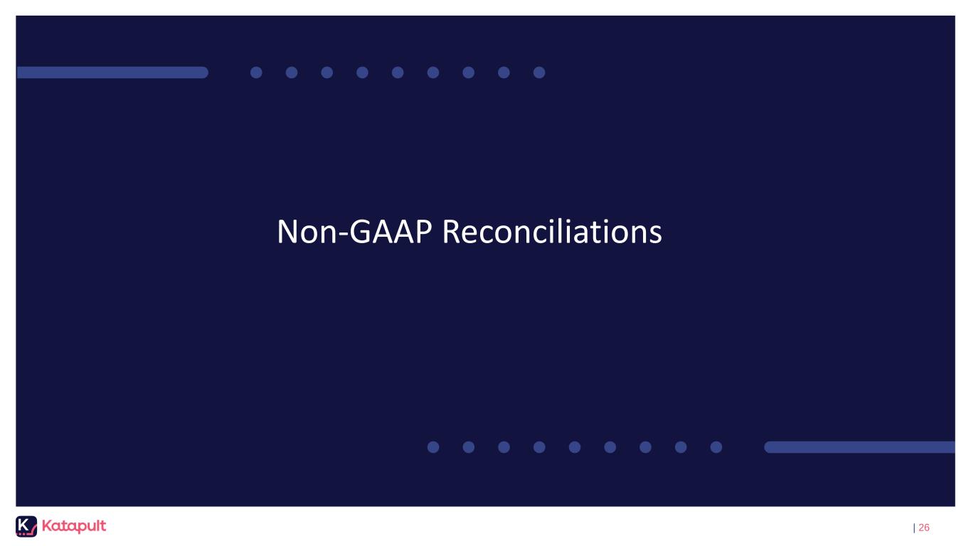 1Q 2022 202320212020 1Q 2Q 3Q 4Q 2019 Gross Originations (2019-2023) Gross Originations Our business model is compelling; gross origination trends are a leading indicator of future revenue streams as new merchants are onboarded and leases are initiated. The new Katapult Pay feature on our mobile app is expected to drive gross originations, accelerate merchant onboarding, and reduce costs 1Q 2Q 3Q 4Q 1Q 2Q 3Q 4Q 1Q 2Q 3Q 4Q 1Q 2022 202320212020 1Q 2Q 3Q 4Q 2019 1Q 2Q 3Q 4Q 1Q 2Q 3Q 4Q 1Q 2Q 3Q 4Q Operating Expenses (2019-2023) Operating Expenses 2022 was an investment year in technology introducing new products, such as our mobile app featuring Katapult Pay. We are now optimizing these investments and instituted comprehensive expense saving initiatives which will continue to translate into improving operating leverage and profitability | 25 $0 $10,000 $20,000 $30,000 $40,000 $50,000 $60,000 $70,000 $80,000 $90,000 (in Thousands) - 2,000 4,000 6,000 8,000 10,000 12,000 14,000 16,000 (in Thousands)