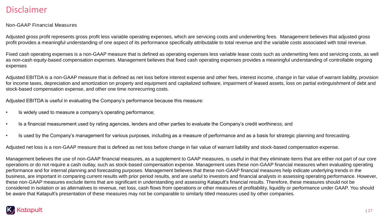 Disclaimer Non-GAAP Financial Measures Adjusted gross profit represents gross profit less variable operating expenses, which are servicing costs and underwriting fees. Management believes that adjusted gross profit provides a meaningful understanding of one aspect of its performance specifically attributable to total revenue and the variable costs associated with total revenue. Fixed cash operating expenses is a non-GAAP measure that is defined as operating expenses less variable lease costs such as underwriting fees and servicing costs, as well as non-cash equity-based compensation expenses. Management believes that fixed cash operating expenses provides a meaningful understanding of controllable ongoing expenses Adjusted EBITDA is a non-GAAP measure that is defined as net loss before interest expense and other fees, interest income, change in fair value of warrant liability, provision for income taxes, depreciation and amortization on property and equipment and capitalized software, impairment of leased assets, loss on partial extinguishment of debt and stock-based compensation expense, and other one time nonrecurring costs. Adjusted EBITDA is useful in evaluating the Company’s performance because this measure: • Is widely used to measure a company’s operating performance; • Is a financial measurement used by rating agencies, lenders and other parties to evaluate the Company’s credit worthiness; and • Is used by the Company’s management for various purposes, including as a measure of performance and as a basis for strategic planning and forecasting. Adjusted net loss is a non-GAAP measure that is defined as net loss before change in fair value of warrant liability and stock-based compensation expense. Management believes the use of non-GAAP financial measures, as a supplement to GAAP measures, is useful in that they eliminate items that are either not part of our core operations or do not require a cash outlay, such as stock-based compensation expense. Management uses these non-GAAP financial measures when evaluating operating performance and for internal planning and forecasting purposes. Management believes that these non-GAAP financial measures help indicate underlying trends in the business, are important in comparing current results with prior period results, and are useful to investors and financial analysts in assessing operating performance. However, these non-GAAP measures exclude items that are significant in understanding and assessing Katapult’s financial results. Therefore, these measures should not be considered in isolation or as alternatives to revenue, net loss, cash flows from operations or other measures of profitability, liquidity or performance under GAAP. You should be aware that Katapult’s presentation of these measures may not be comparable to similarly titled measures used by other companies. | 27