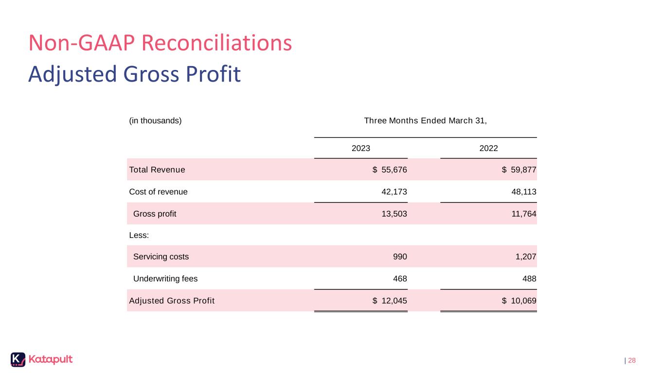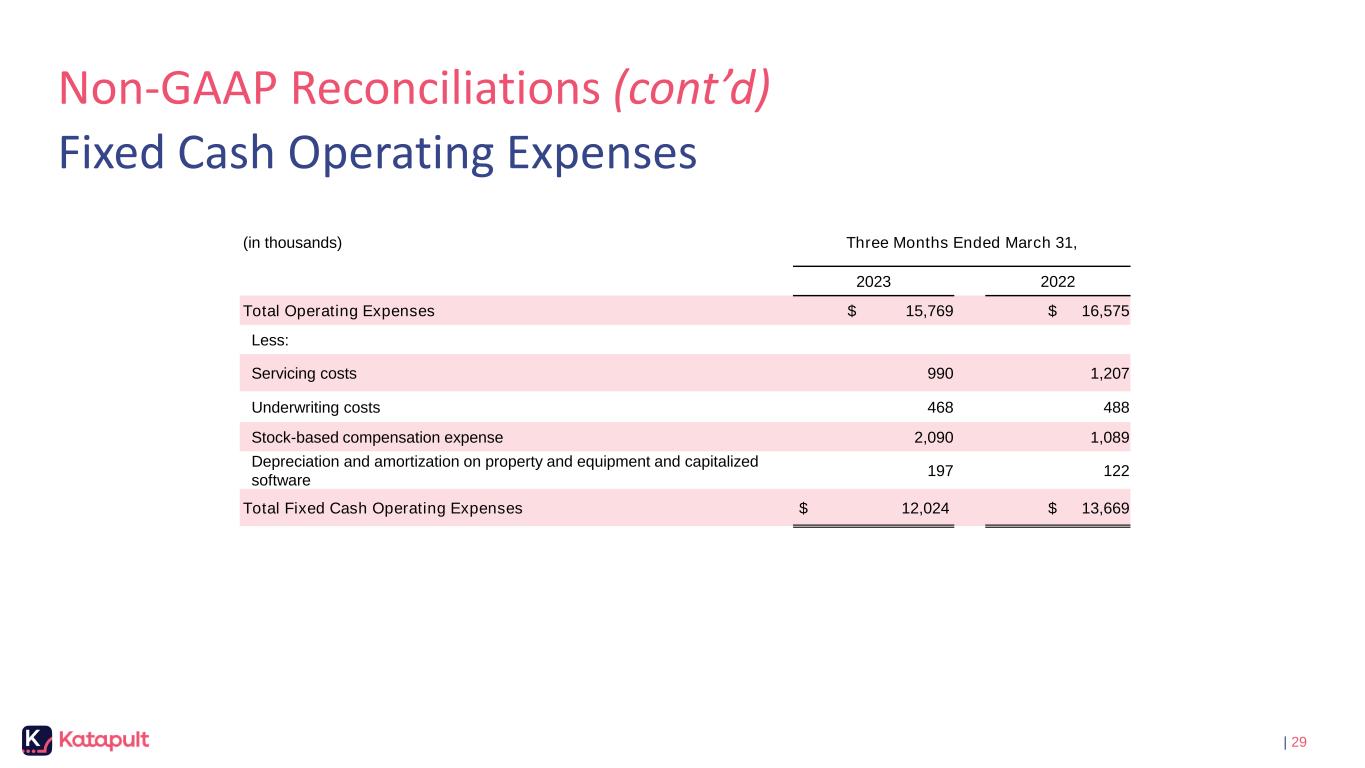 Non-GAAP Reconciliations Adjusted Gross Profit (in thousands) Three Months Ended March 31, 2023 2022 Total Revenue $ 55,676 $ 59,877 Cost of revenue 42,173 48,113 Gross profit 13,503 11,764 Less: Servicing costs 990 1,207 Underwriting fees 468 488 Adjusted Gross Profit $ 12,045 $ 10,069 | 28
