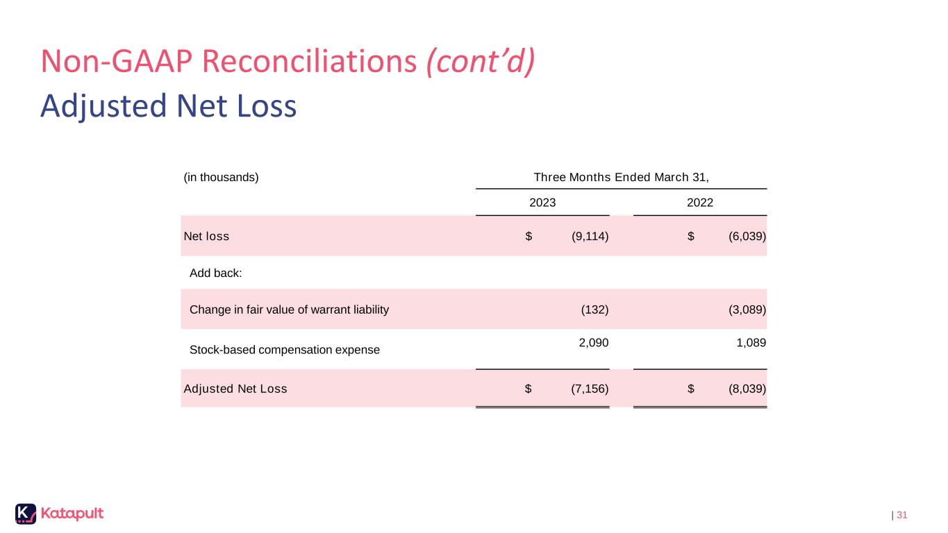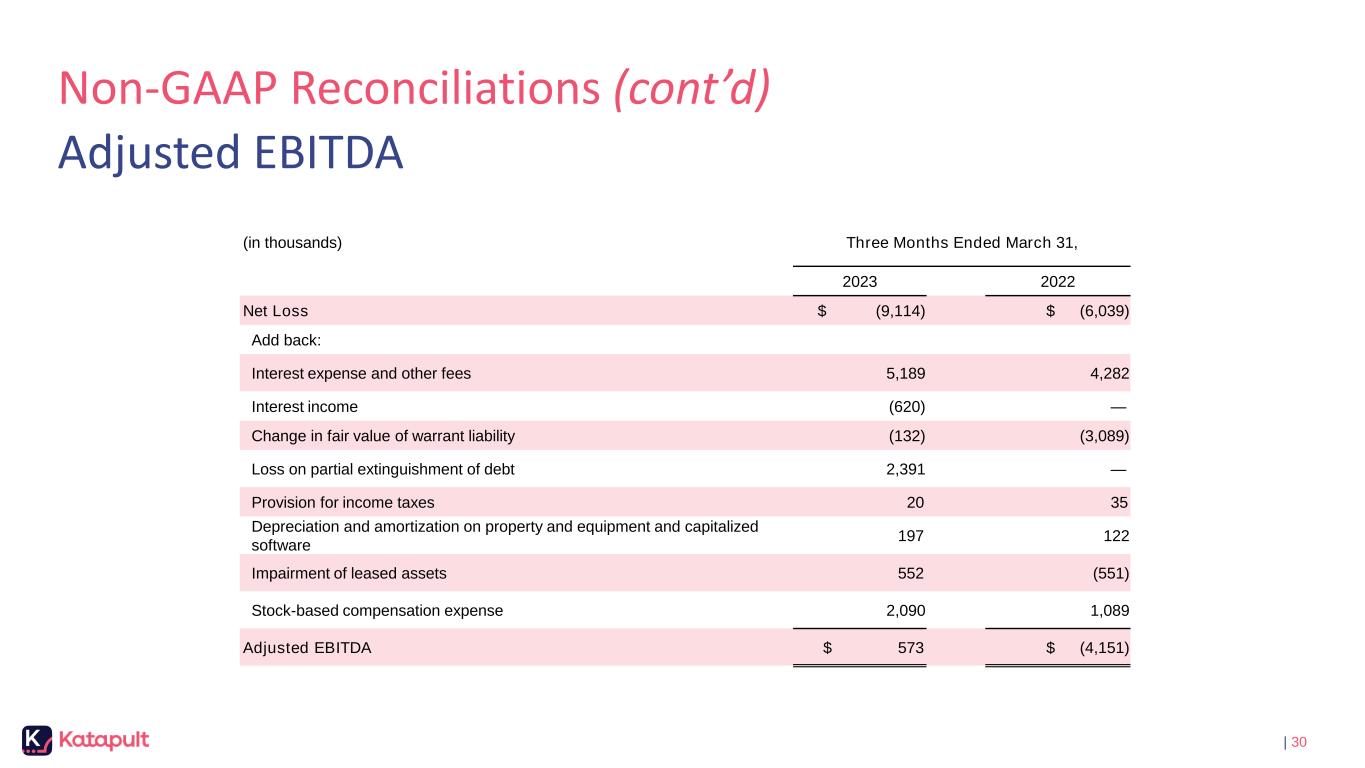 Non-GAAP Reconciliations (cont’d) Adjusted EBITDA (in thousands) Three Months Ended March 31, 2023 2022 Net Loss $ (9,114) $ (6,039) Add back: Interest expense and other fees 5,189 4,282 Interest income (620) — Change in fair value of warrant liability (132) (3,089) Loss on partial extinguishment of debt 2,391 — Provision for income taxes 20 35 Depreciation and amortization on property and equipment and capitalized software 197 122 Impairment of leased assets 552 (551) Stock-based compensation expense 2,090 1,089 Adjusted EBITDA $ 573 $ (4,151) | 30