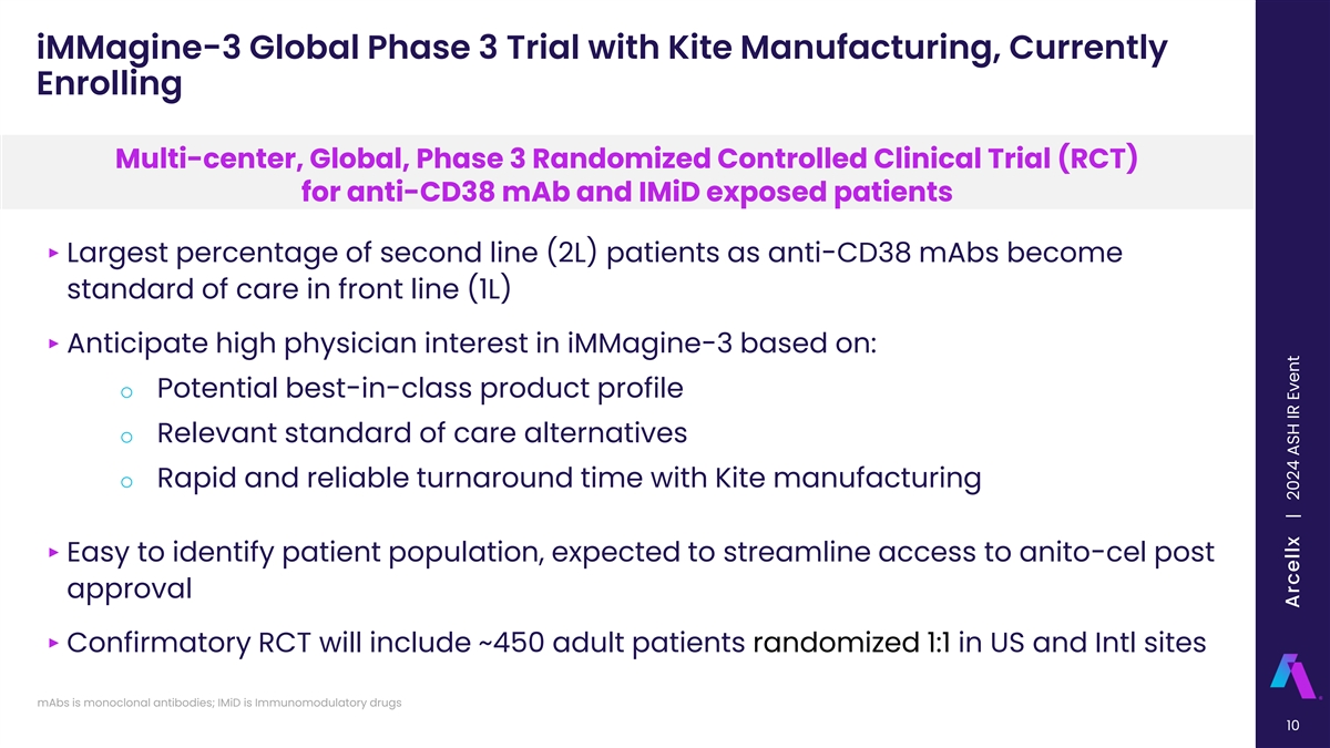 Anito-cel Can Significantly Expand CAR T Access for MM Patients Anito-cel has seen 0 cases of Parkinsonism, Anito-cel CRS median time to onset ~4 days and Guillain-Barré syndrome, or cranial nerve palsies, median duration ~3 days, potentially limiting time in potentially driving patient volume in earlier lines of hospital and driving outpatient treatment therapy All other 100% 100% BCMA agents 86% (~7% of all cases of 80% 80% delayed neurotoxicity*) Carvykti 60% 60% (~93% of all cases of 40% 40% delayed 17% 20% neurotoxicity*) 20% 0% 0% iMM-1 No CRS iMM-1 Gr < 1 CRS Q1 - Q3 2024 ~92% of iMM-1 patients had no CRS symptoms 10 days Anito-cel has seen 0 cases of delayed or non-ICANS from infusion neurotoxicity to date >80% of CAR T cases have favorable reimbursement through case rate agreements or ASP+ *FDA FAERS Database Query was “CRANIAL NERVE PARALYSIS”, “CRANIAL NERVE PALSIES MULTIPLE”, “GUILLAN-BARRE SYNDROME”, “PARKINSONISM” Komodo claims analysis from 3/1/2022-3/1/2023; Freeman et al., Oral Presentation, ASH (Dec 2024); FDA FAERS Database 9 Arcellx | 2024 ASH IR Event