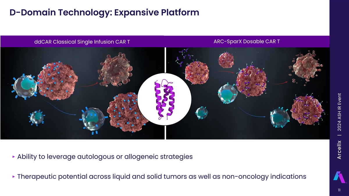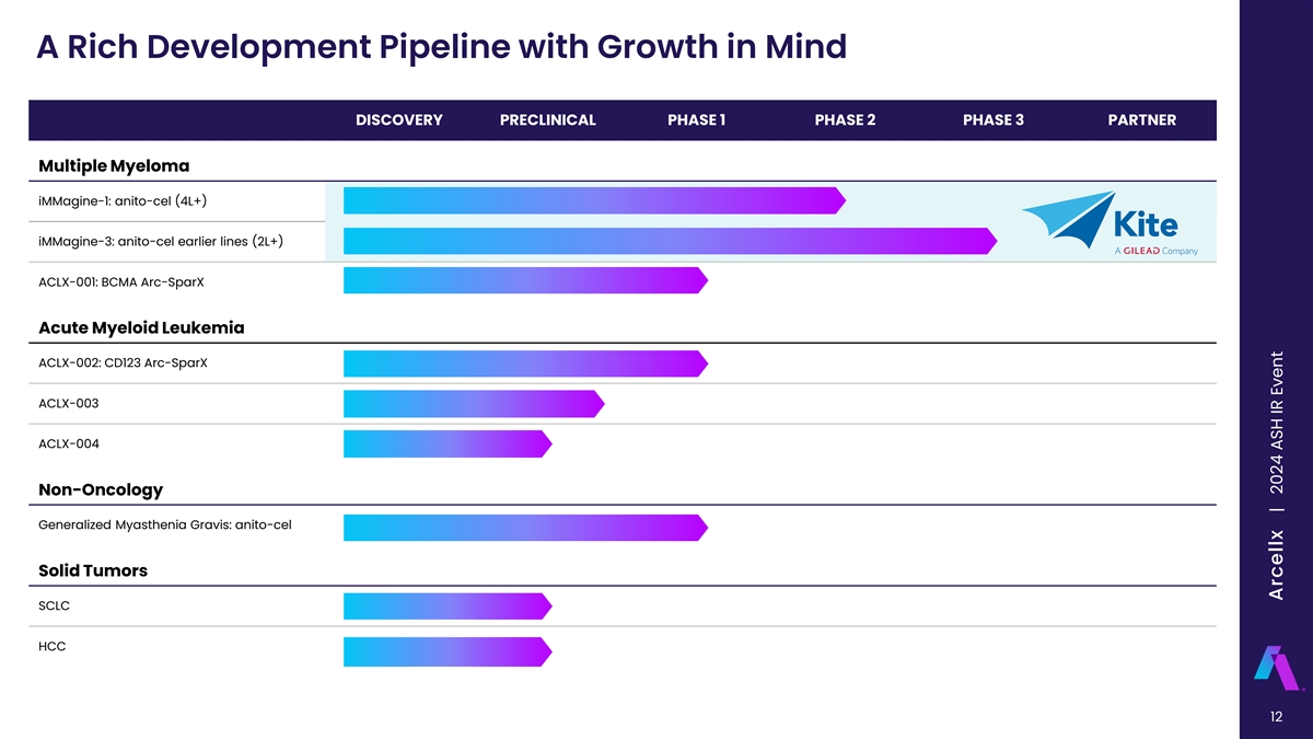D-Domain Technology: Expansive Platform ARC-SparX Dosable CAR T ddCAR Classical Single Infusion CAR T ‣ Ability to leverage autologous or allogeneic strategies ‣ Therapeutic potential across liquid and solid tumors as well as non-oncology indications 11 CONFIDENTIAL Arcellx | 2024 ASH IR Event