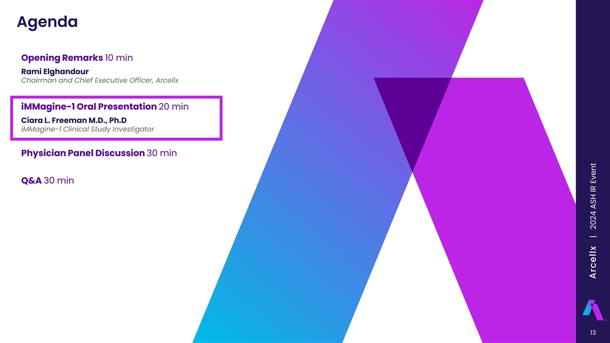 A Rich Development Pipeline with Growth in Mind DISCOVERY PRECLINICAL PHASE 1 PHASE 2 PHASE 3 PARTNER Multiple Myeloma iMMagine-1: anito-cel (4L+) iMMagine-3: anito-cel earlier lines (2L+) ACLX-001: BCMA Arc-SparX Acute Myeloid Leukemia ACLX-002: CD123 Arc-SparX ACLX-003 ACLX-004 Non-Oncology Generalized Myasthenia Gravis: anito-cel Solid Tumors SCLC HCC 12 Arcellx | 2024 ASH IR Event