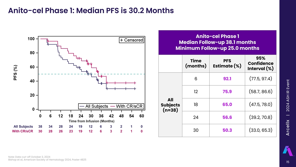 Anito-cel Phase 1: 100% Overall Response and 79% Complete Response 100% 99.6% 97.9% 100% 87.8% 15% 90% 21% 26% 15% 80% 73.4% 70% ORR 60% VPGR+PR 40% 50% CR/sCR 82% 40% 79% 74% 73% 30% 20% 33% 10% 0% Anito-cel Ph1 Cartitude-1 MAIC Cartitude-1 KarMMa Legend-2 38.1 mo. follow-up 27.7 mo. follow-up 27.7 mo. follow-up 24.8 mo. follow-up 47.8 mo. follow-up 1 2 3 4 5 (n=38) (n=97) (n=97) (n=128) (n=74) Data cut-off October 3, 2024 Note: MAIC is matching-adjusted indirect comparison, a J&J study comparing Cartitude-1 results by adjusting its population to match that of KarMMa; Data above are not from head-to-head studies. Cross-trial data 14 interpretation should be considered with caution as it is limited by differences in median follow-up, study population, design, and other factors. 1 2 3 4 5 Bishop et al. (2024); Martin et al. (2022); Martin et al. (2023); Anderson et al. (2021); Zhao et al. Arcellx | 2024 ASH IR Event
