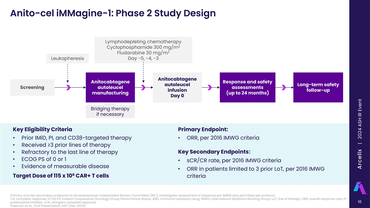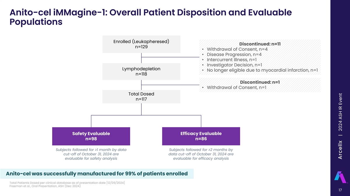 Anito-cel iMMagine-1: Phase 2 Study Design Lymphodepleting chemotherapy 2 Cyclophosphamide 300 mg/m 2 Fludarabine 30 mg/m Leukapheresis Day -5, -4, -3 Anitocabtagene Anitocabtagene Response and safety autoleucel Long-term safety Screening autoleucel assessments infusion follow-up manufacturing (up to 24 months) Day 0 Bridging therapy if necessary Key Eligibility Criteria Primary Endpoint: • Prior IMiD, PI, and CD38-targeted therapy• ORR, per 2016 IMWG criteria • Received ≥3 prior lines of therapy Key Secondary Endpoints: • Refractory to the last line of therapy • ECOG PS of 0 or 1 • sCR/CR rate, per 2016 IMWG criteria • Evidence of measurable disease • ORR in patients limited to 3 prior LoT, per 2016 IMWG 6 Target Dose of 115 x 10 CAR+ T cells criteria Primary and key secondary endpoints to be assessed per Independent Review Committee (IRC); Investigator assessment of response per IMWG also permitted per protocol. CR, complete response; ECOG PS, Eastern Cooperative Oncology Group Performance Status; IMiD, immunomodulatory drug; IMWG, International Myeloma Working Group; LoT, line of therapy; ORR, overall response rate; PI, 16 proteosome inhibitor; sCR, stringent complete response. Freeman et al., Oral Presentation, ASH (Dec 2024) | Freeman et al, American Society of Hematology 2024, Abstract 1031 Arcellx | 2024 ASH IR Event