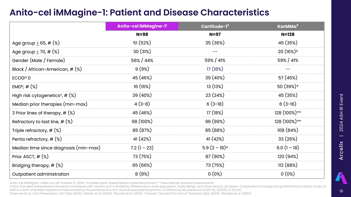 Anito-cel iMMagine-1: Overall Patient Disposition and Evaluable Populations Enrolled (Leukapheresed) Discontinued: n=11 n=129 • Withdrawal of Consent, n=4 • Disease Progression, n=4 • Intercurrent Illness, n=1 • Investigator Decision, n=1 Lymphodepletion • No longer eligible due to myocardial infarction, n=1 n=118 Discontinued: n=1 • Withdrawal of Consent, n=1 Total Dosed n=117 Safety Evaluable Efficacy Evaluable n=98 n=86 Subjects followed for ≥1 month by data Subjects followed for ≥2 months by cut-off of October 31, 2024 are data cut-off of October 31, 2024 are evaluable for safety analysis evaluable for efficacy analysis Anito-cel was successfully manufactured for 99% of patients enrolled Total Patients Dosed per clinical database as of presentation date [12/09/2024] Freeman et al., Oral Presentation, ASH (Dec 2024) 17 | Freeman et al, American Society of Hematology 2024, Abstract 1031 Arcellx | 2024 ASH IR Event