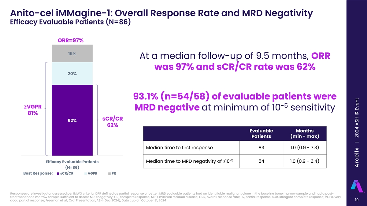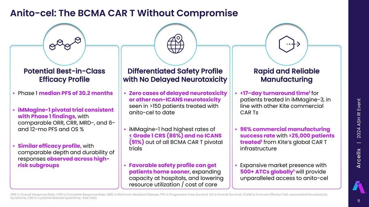Anito-cel iMMagine-1: Patient and Disease Characteristics 1 2 3 Anito-cel iMMagine-1 Cartitude-1 KarMMa N=98 N=97 N=128 Age group > 65, # (%) 51 (52%) 35 (36%) 45 (35%) 5 Age group > 70, # (%) 30 (31%) -- 20 (16%) Gender (Male / Female) 56% / 44% 59% / 41% 59% / 41% Black / African-American, # (%) 9 (9%) 17 (18%) -- a ECOG 0 45 (46%) 39 (40%) 57 (45%) b EMD , # (%) 16 (16%) 13 (13%) 50 (39%)* c High risk cytogenetics , # (%) 39 (40%) 23 (24%) 45 (35%) Median prior therapies (min-max) 4 (3-8) 6 (3-18) 6 (3-16) 3 Prior lines of therapy, # (%) 45 (46%) 17 (18%) 128 (100%)** Refractory to last line, # (%) 98 (100%) 96 (99%) 128 (100%)** 85 (87%) 85 (88%) 108 (84%) Triple refractory, # (%) 41 (42%) 41 (42%) 33 (26%) Penta refractory, # (%) 4 5.9 (2 – 18) 6.0 (1 – 18) Median time since diagnosis (min-max) 7.2 (1 – 23) 73 (75%) 87 (90%) 120 (94%) Prior ASCT, # (%) 65 (66%) 73 (75%) 112 (88%) Bridging therapy, # (%) 8 (8%) 0 (0%) 0 (0%) Outpatient administration Anito-cel iMMagine-1 data cut-off October 31, 2024; *Includes bone-based lesions (plasmacytomas); **Assumed per protocol requirements Cross-trial data interpretation should be considered with caution as it is limited by differences in study population, study design, and other factors; a) Eastern Cooperative Oncology Group Performance Status Scale; b) EMD is a form of Multiple Myeloma characterized by the presence of a non-bone based plasmacytoma; c) Defined as the presence of Del 17p, t(14;16), or t(4;14) 18 1 2 3 4 5 Freeman et al., Oral Presentation, ASH (Dec 2024); Martin et al. (2023); Munshi et al. (2021); Janssen Carvykti Prior Line of Therapies (Dec 2024); Berdeja et al. (2020) Arcellx | 2024 ASH IR Event