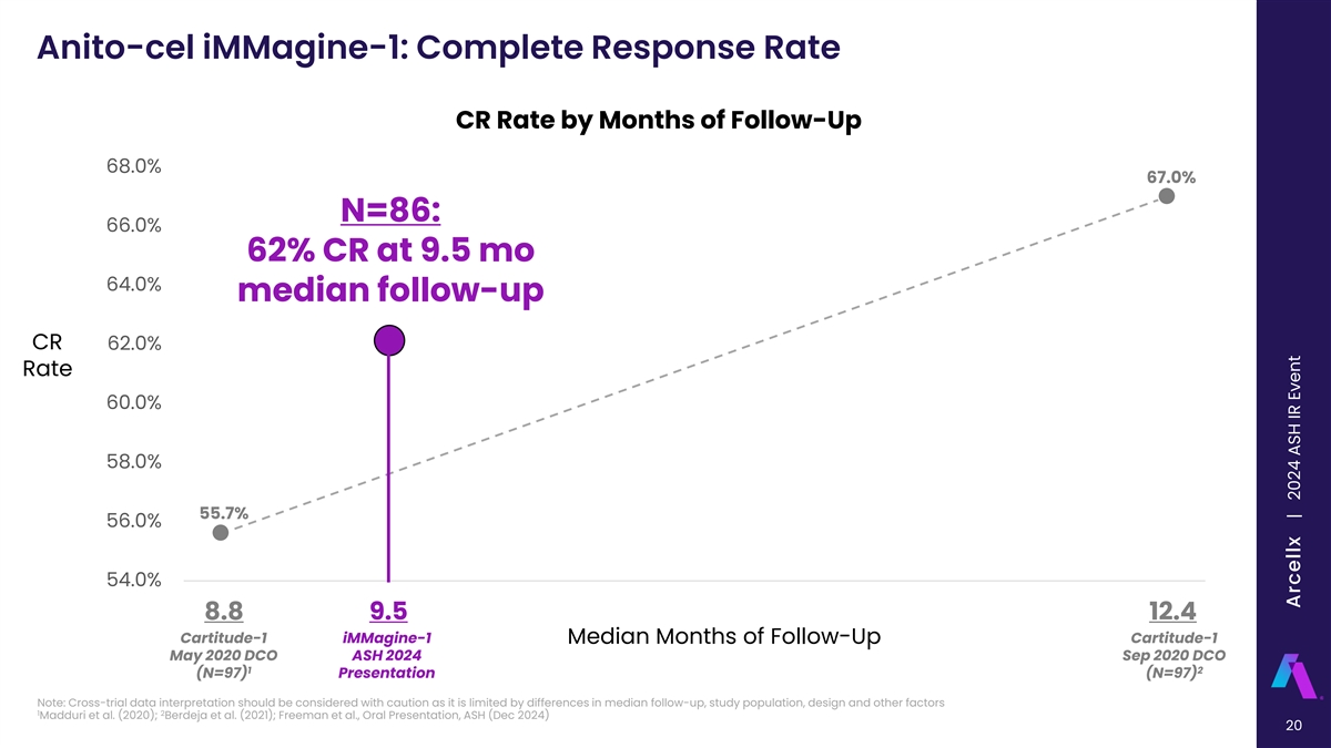 Anito-cel iMMagine-1: Overall Response Rate and MRD Negativity Efficacy Evaluable Patients (N=86) ORR=97% 15% At a median follow-up of 9.5 months, ORR was 97% and sCR/CR rate was 62% 20% 93.1% (n=54/58) of evaluable patients were -5 ≥VGPR MRD negative at minimum of 10 sensitivity 81% sCR/CR 62% 62% Evaluable Months Patients (min - max) Median time to first response 83 1.0 (0.9 - 7.3) -5 Median time to MRD negativity of ≤10 54 1.0 (0.9 - 6.4) Efficacy Evaluable Patients (N=86) Best Response: sCR/CR VGPR PR Responses are investigator assessed per IMWG criteria, ORR defined as partial response or better; MRD evaluable patients had an identifiable malignant clone in the baseline bone marrow sample and had a post- treatment bone marrow sample sufficient to assess MRD negativity; CR, complete response; MRD, minimal residual disease; ORR, overall response rate; PR, partial response; sCR, stringent complete response; VGPR, very 19 good partial response; Freeman et al., Oral Presentation, ASH (Dec 2024), Data cut-off October 31, 2024 | Freeman et al, American Society of Hematology 2024, Abstract 1031 Arcellx | 2024 ASH IR Event