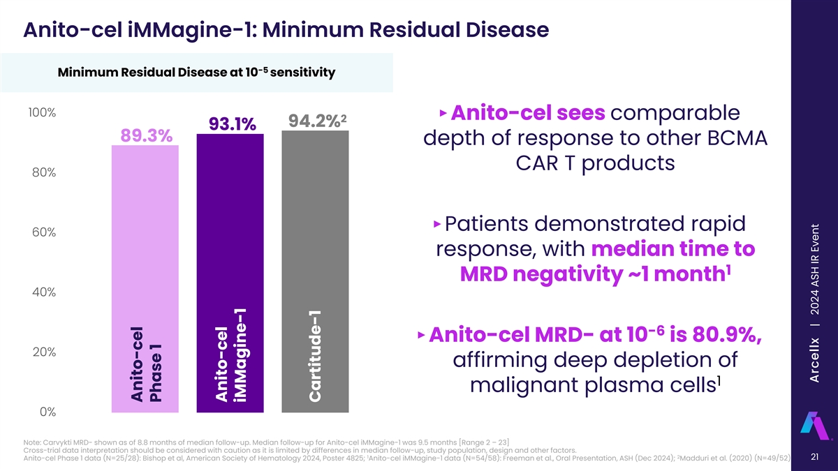 Anito-cel iMMagine-1: Complete Response Rate CR Rate by Months of Follow-Up 68.0% 67.0% N=86: 66.0% 62% CR at 9.5 mo 64.0% median follow-up CR 62.0% Rate 60.0% 58.0% 55.7% 56.0% 54.0% 8.8 9.1 9.4 9.7 10 10.3 10.6 10.9 11.2 11.5 11.8 12.1 12.4 8.8 9.5 12.4 Cartitude-1 iMMagine-1 Cartitude-1 Median Months of Follow-Up May 2020 DCO ASH 2024 Sep 2020 DCO 1 2 (N=97) Presentation (N=97) Note: Cross-trial data interpretation should be considered with caution as it is limited by differences in median follow-up, study population, design and other factors 1 2 Madduri et al. (2020); Berdeja et al. (2021); Freeman et al., Oral Presentation, ASH (Dec 2024) 20 Arcellx | 2024 ASH IR Event