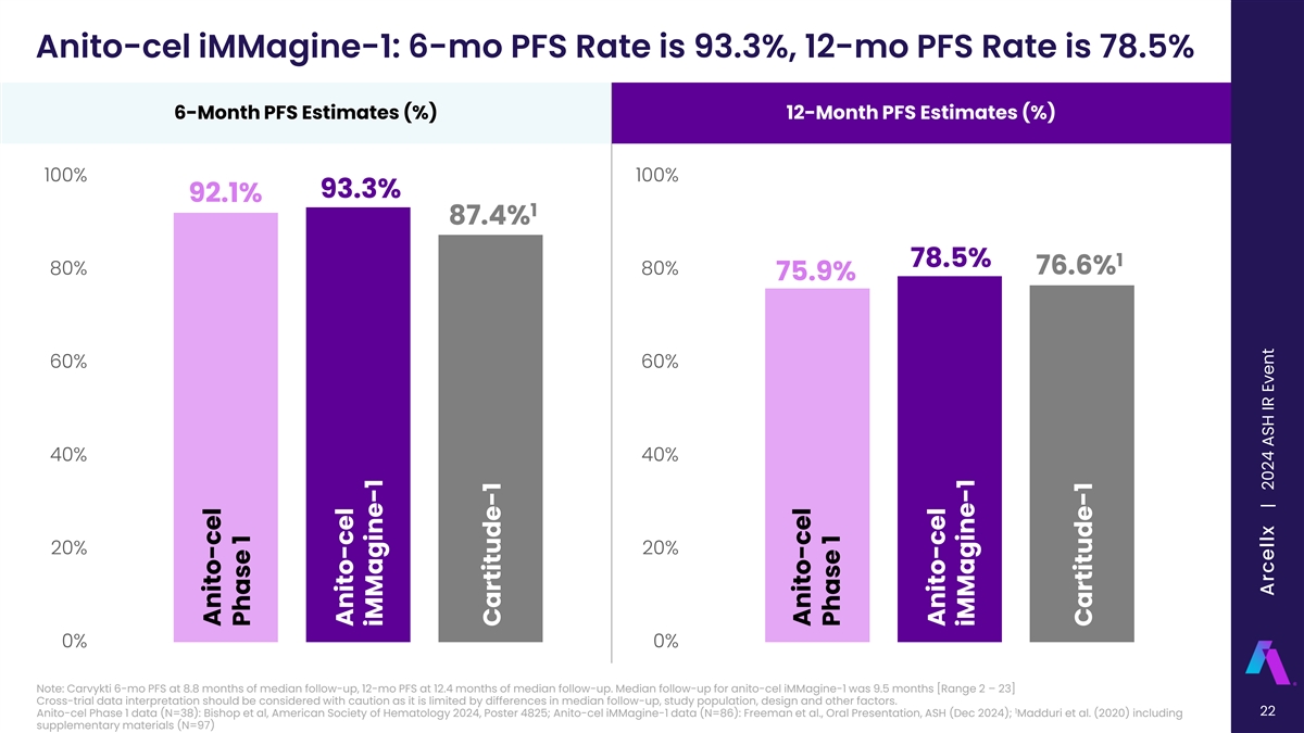 Anito-cel iMMagine-1: Minimum Residual Disease -5 Minimum Residual Disease at 10 sensitivity 100% ‣ Anito-cel sees comparable 2 94.2% 93.1% 89.3% depth of response to other BCMA CAR T products 80% ‣Patients demonstrated rapid 60% response, with median time to 1 MRD negativity ~1 month 40% -6 ‣ Anito-cel MRD- at 10 is 80.9%, 20% affirming deep depletion of 1 malignant plasma cells 0% Note: Carvykti MRD- shown as of 8.8 months of median follow-up. Median follow-up for Anito-cel iMMagine-1 was 9.5 months [Range 2 – 23] Cross-trial data interpretation should be considered with caution as it is limited by differences in median follow-up, study population, design and other factors. 1 2 21 Anito-cel Phase 1 data (N=25/28): Bishop et al, American Society of Hematology 2024, Poster 4825; Anito-cel iMMagine-1 data (N=54/58): Freeman et al., Oral Presentation, ASH (Dec 2024); Madduri et al. (2020) (N=49/52) Anito-cel Phase 1 Anito-cel iMMagine-1 Cartitude-1 Arcellx | 2024 ASH IR Event