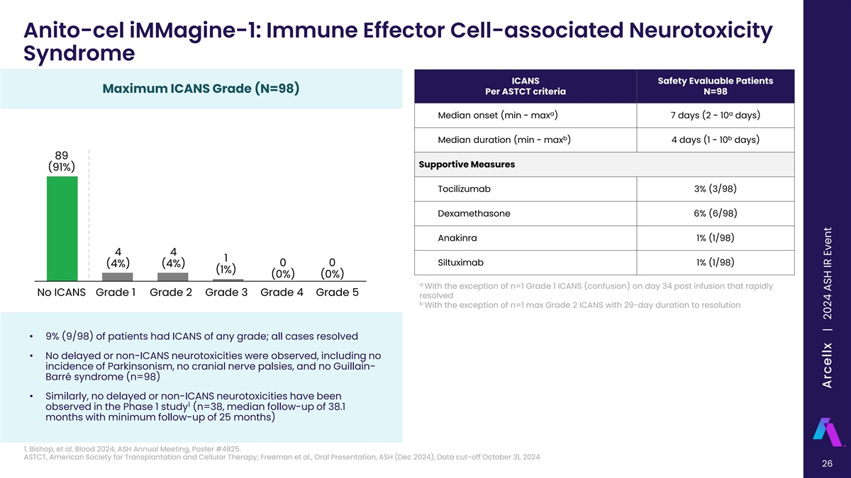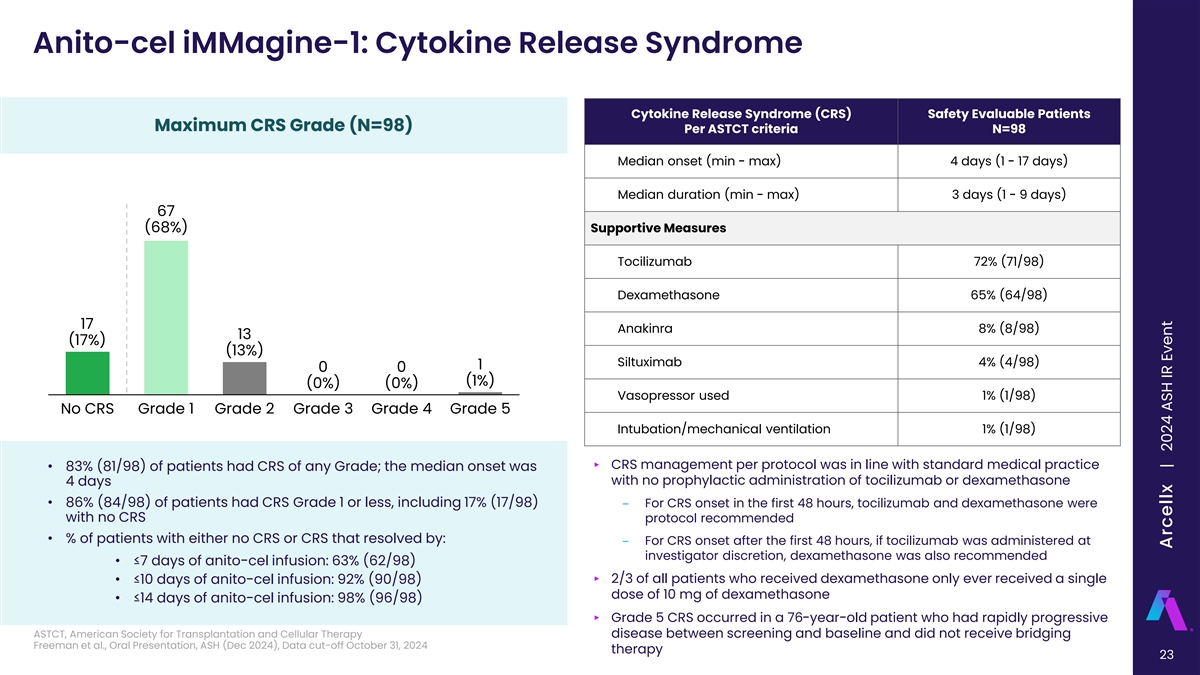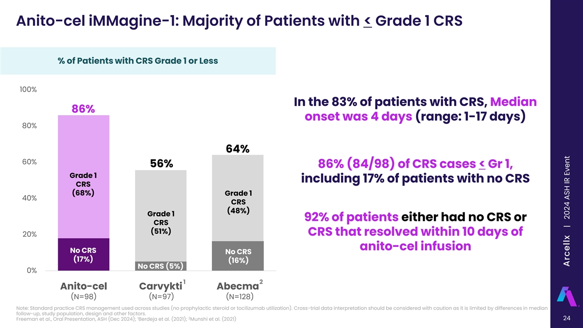Anito-cel iMMagine-1: Cytokine Release Syndrome Cytokine Release Syndrome (CRS) Safety Evaluable Patients Maximum CRS Grade (N=98) Per ASTCT criteria N=98 Median onset (min - max) 4 days (1 - 17 days) Median duration (min - max) 3 days (1 - 9 days) 67 (68%) Supportive Measures Tocilizumab 72% (71/98) Dexamethasone 65% (64/98) 17 Anakinra 8% (8/98) 13 (17%) (13%) Siltuximab 4% (4/98) 1 0 0 (1%) (0%) (0%) Vasopressor used 1% (1/98) No CRS Grade 1 Grade 2 Grade 3 Grade 4 Grade 5 Intubation/mechanical ventilation 1% (1/98) ‣ CRS management per protocol was in line with standard medical practice • 83% (81/98) of patients had CRS of any Grade; the median onset was with no prophylactic administration of tocilizumab or dexamethasone 4 days • 86% (84/98) of patients had CRS Grade 1 or less, including 17% (17/98) ‒ For CRS onset in the first 48 hours, tocilizumab and dexamethasone were with no CRS protocol recommended • % of patients with either no CRS or CRS that resolved by: ‒ For CRS onset after the first 48 hours, if tocilizumab was administered at investigator discretion, dexamethasone was also recommended • ≤7 days of anito-cel infusion: 63% (62/98) • ≤10 days of anito-cel infusion: 92% (90/98)‣ 2/3 of all patients who received dexamethasone only ever received a single dose of 10 mg of dexamethasone • ≤14 days of anito-cel infusion: 98% (96/98) ‣ Grade 5 CRS occurred in a 76-year-old patient who had rapidly progressive ASTCT, American Society for Transplantation and Cellular Therapy disease between screening and baseline and did not receive bridging Freeman et al., Oral Presentation, ASH (Dec 2024), Data cut-off October 31, 2024 therapy 23 | Freeman et al, American Society of Hematology 2024, Abstract 1031 Arcellx | 2024 ASH IR Event
