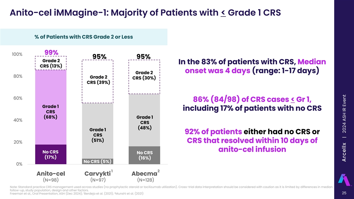 Anito-cel iMMagine-1: Majority of Patients with < Grade 1 CRS % of Patients with CRS Grade 1 or Less 100% In the 83% of patients with CRS, Median 86% onset was 4 days (range: 1-17 days) 80% 64% 60% 56% 86% (84/98) of CRS cases < Gr 1, Grade 1 including 17% of patients with no CRS CRS (68%) Grade 1 40% CRS (48%) Grade 1 92% of patients either had no CRS or CRS (51%) CRS that resolved within 10 days of 20% anito-cel infusion No CRS No CRS (17%) (16%) No CRS (5%) 0% 1 2 Anito-cel Carvykti Abecma (N=98) (N=97) (N=128) Note: Standard practice CRS management used across studies (no prophylactic steroid or tocilizumab utilization). Cross-trial data interpretation should be considered with caution as it is limited by differences in median follow-up, study population, design and other factors. 1 2 24 Freeman et al., Oral Presentation, ASH (Dec 2024); Berdeja et al. (2021); Munshi et al. (2021) Arcellx | 2024 ASH IR Event