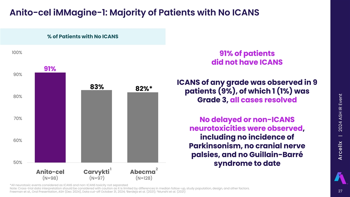 Anito-cel iMMagine-1: Immune Effector Cell-associated Neurotoxicity Syndrome ICANS Safety Evaluable Patients Maximum ICANS Grade (N=98) Per ASTCT criteria N=98 a a Median onset (min - max ) 7 days (2 - 10 days) b b Median duration (min - max ) 4 days (1 - 10 days) 89 Supportive Measures (91%) Tocilizumab 3% (3/98) Dexamethasone 6% (6/98) Anakinra 1% (1/98) 4 4 1 Siltuximab 1% (1/98) 0 0 (4%) (4%) (1%) (0%) (0%) a With the exception of n=1 Grade 1 ICANS (confusion) on day 34 post infusion that rapidly No ICANS Grade 1 Grade 2 Grade 3 Grade 4 Grade 5 resolved b With the exception of n=1 max Grade 2 ICANS with 29-day duration to resolution • 9% (9/98) of patients had ICANS of any grade; all cases resolved • No delayed or non-ICANS neurotoxicities were observed, including no incidence of Parkinsonism, no cranial nerve palsies, and no Guillain- Barré syndrome (n=98) • Similarly, no delayed or non-ICANS neurotoxicities have been 1 observed in the Phase 1 study (n=38, median follow-up of 38.1 months with minimum follow-up of 25 months) 1. Bishop, et al. Blood 2024; ASH Annual Meeting, Poster #4825. ASTCT, American Society for Transplantation and Cellular Therapy; Freeman et al., Oral Presentation, ASH (Dec 2024), Data cut-off October 31, 2024 26 | Freeman et al, American Society of Hematology 2024, Abstract 1031 Arcellx | 2024 ASH IR Event