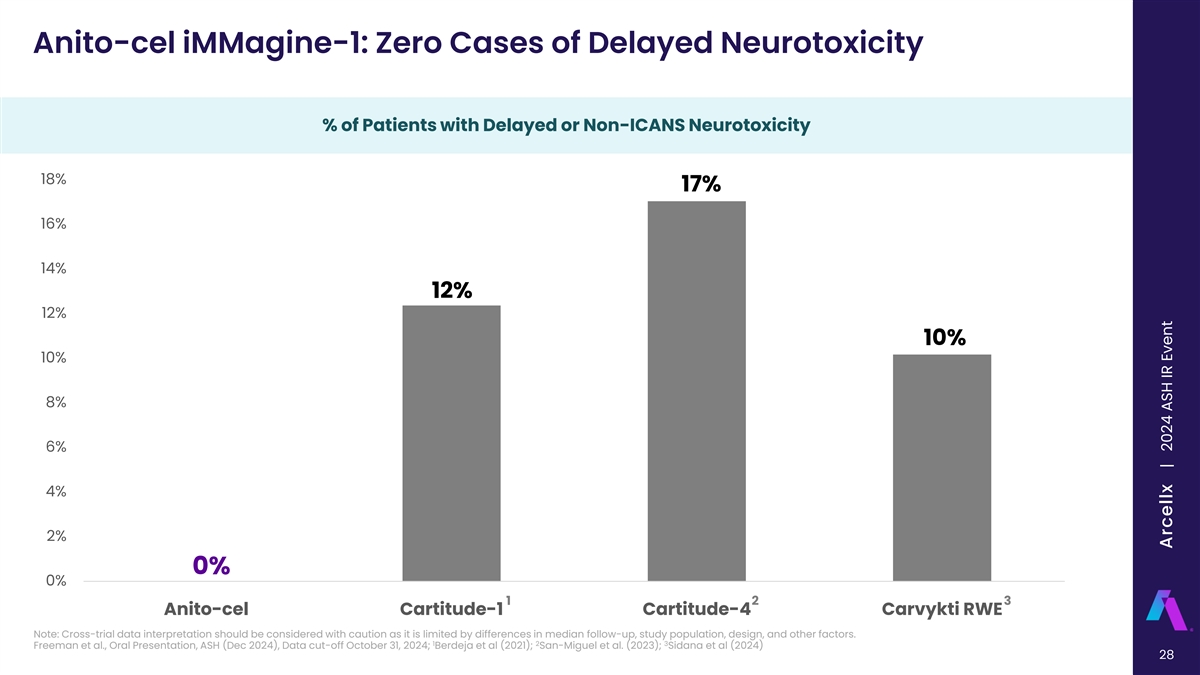 Anito-cel iMMagine-1: Majority of Patients with No ICANS % of Patients with No ICANS % of Patients with Grade 1 or less CRS 100% 91% of patients did not have ICANS 91% 90% ICANS of any grade was observed in 9 83% 82%* patients (9%), of which 1 (1%) was 80% Grade 3, all cases resolved 70% No delayed or non-ICANS neurotoxicities were observed, including no incidence of 60% Parkinsonism, no cranial nerve palsies, and no Guillain-Barré 50% syndrome to date 1 2 Anito-cel Carvykti Abecma (N=98) (N=97) (N=128) *All neurotoxic events considered as ICANS and non-ICANS toxicity not separated Note: Cross-trial data interpretation should be considered with caution as it is limited by differences in median follow-up, study population, design, and other factors. 1 2 27 Freeman et al., Oral Presentation, ASH (Dec 2024), Data cut-off October 31, 2024; Berdeja et al. (2021); Munshi et al. (2021) Arcellx | 2024 ASH IR Event
