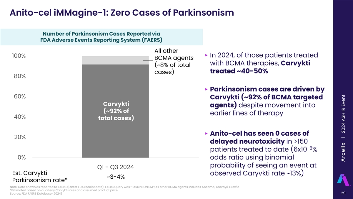 Anito-cel iMMagine-1: Zero Cases of Delayed Neurotoxicity % of Patients with Delayed or Non-ICANS Neurotoxicity % of Patients with Delayed Neurotoxicity 18% 17% 16% 14% 12% 12% 10% 10% 8% 6% 4% 2% 0% 0% 1 2 3 Anito-cel Cartitude-1 Cartitude-4 Carvykti RWE Note: Cross-trial data interpretation should be considered with caution as it is limited by differences in median follow-up, study population, design, and other factors. 1 2 3 Freeman et al., Oral Presentation, ASH (Dec 2024), Data cut-off October 31, 2024; Berdeja et al (2021); San-Miguel et al. (2023); Sidana et al (2024) 28 All Delayed Neurotoxicities Arcellx | 2024 ASH IR Event