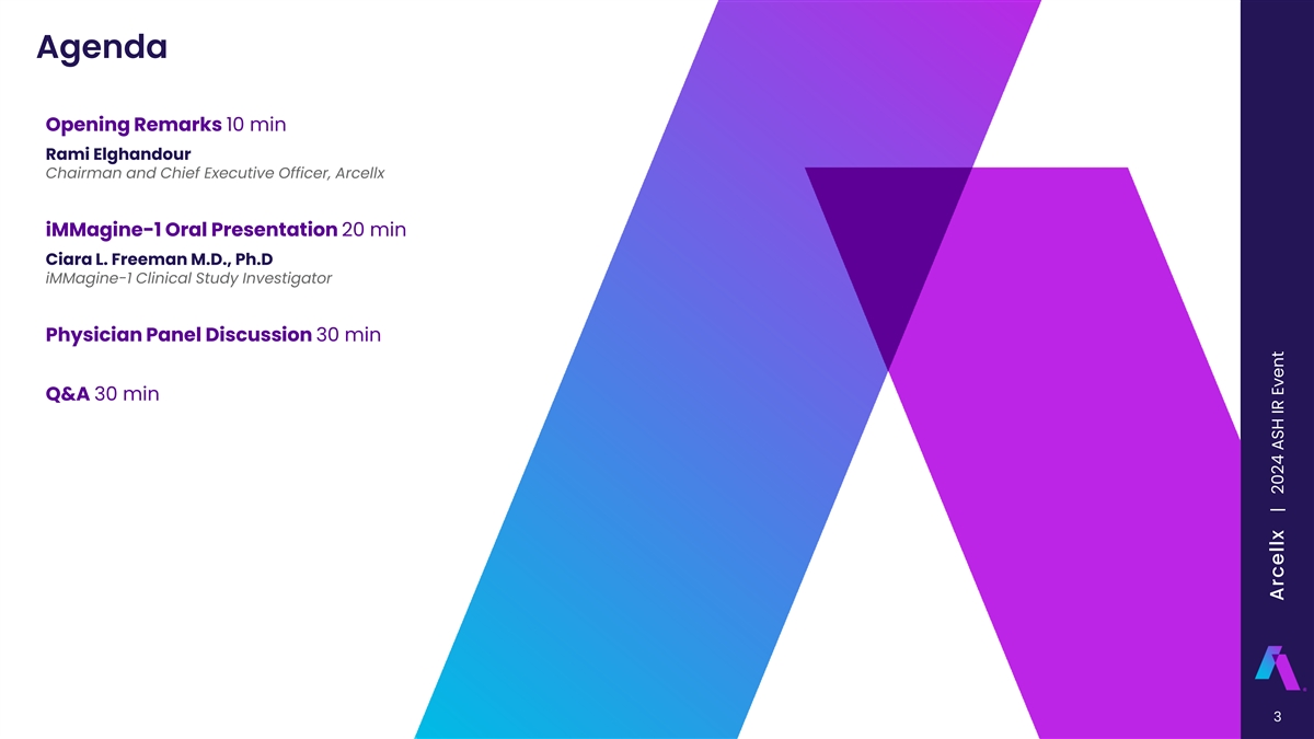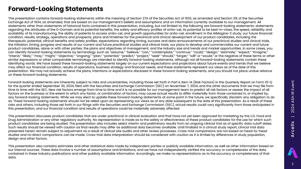Forward-Looking Statements This presentation contains forward-looking statements within the meaning of Section 27A of the Securities Act of 1933, as amended and Section 21E of the Securities Exchange Act of 1934, as amended, that are based on our management’s beliefs and assumptions and on information currently available to our management. All statements other than statements of historical facts contained in this presentation, including, but not limited to, the following are forward-looking statements: statements regarding the attributes of the D-Domain and its potential benefits; the safety and efficacy profiles of anito-cel, its potential to be best-in-class, the speed, reliability and scalability of its manufacturing, the ability of patients to access anito-cel, and growth opportunities for anito-cel; enrollment in the iMMagine-3 study; our future financial condition, results, strategy, operations and prospects; plans and timelines for the preclinical and clinical development of our product candidates, including the therapeutic potential, clinical benefits and safety profiles; expectations regarding timing, success and data announcements of our preclinical studies and clinical trials, the initiation, timing, progress and results of our current and future preclinical studies and clinical trials; our plans to develop and commercialize our current and future product candidates, alone or with other parties; the plans and objectives of management; and the industry size and trends and market opportunities. In some cases, you can identify forward-looking statements by terminology such as “assume,” “believe,” “can,” “contemplate,” “continue,” “could,” “design,” “estimate,” “expect,” “imagine,” “intend,” “likely,” “may,” “might,” “objective,” “ongoing,” “plan,” “potential,” “predict,” “project,” “seek” “should,” “target,” “will” or “would,” or the negative of these terms or other similar expressions or other comparable terminology are intended to identify forward-looking statements, although not all forward-looking statements contain these identifying words. We have based these forward-looking statements largely on our current expectations and projections about future events and trends that we believe may affect our financial condition, results of operations, business strategy and financial needs, and these statements represent our views as of the date of this presentation. We may not actually achieve the plans, intentions or expectations disclosed in these forward-looking statements, and you should not place undue reliance on these forward-looking statements. Forward-looking statements are inherently subject to risks and uncertainties, including those set forth in Part II, Item 1A (Risk Factors) in the Quarterly Report on Form 10-Q for the quarter ended September 30, 2024, filed with the Securities and Exchange Commission (SEC) on November 7, 2024, and the other documents that we may file from time to time with the SEC. New risk factors emerge from time to time and it is no possible for our management team to predict all risk factors or assess the impact of all factors on the business or the extent to which any factor, or combination of factors, may cause actual results to differ materially from those contained in, or implied by, any forward-looking statements. While we may elect to update these forward-looking statements at some point in the future, we specifically disclaim any obligation to do so. These forward-looking statements should not be relied upon as representing our views as of any date subsequent to the date of this presentation. As a result of these risks and others, including those set forth in our filings with the Securities and Exchange Commission (SEC), actual results could vary significantly from those anticipated in this presentation, and our financial condition and results of operations could be materially adversely affected. This presentation discusses product candidates that are under preclinical or clinical evaluation and that have not yet been approved for marketing by the U.S. Food and Drug Administration or any other regulatory authority. No representation is made as to the safety or effectiveness of these product candidates for the use for which such product candidates are being studied. The presentation also includes select interim and preliminary results from an ongoing clinical trial as of specific data cutoff dates. Such results should be viewed with caution as final results may differ as additional data becomes available. Until finalized in a clinical study report, clinical trial data presented herein remain subject to adjustment as a result of clinical site audits and other review processes. Cross-trial comparisons are not based on head-to-head studies and no direct comparisons can be made. Cross-trial data interpretation should be considered with caution as it is limited by differences in study population, design and other factors. This presentation also contains estimates and other statistical data made by independent parties or publicly available information, as well as other information based on our internal sources. These data involve a number of assumptions and limitations, and we have not independently verified the accuracy or completeness of the data contained in these industry publications and other publicly available information. Accordingly, we make no representations as to the accuracy or completeness of that data. 2 Arcellx | 2024 ASH IR Event