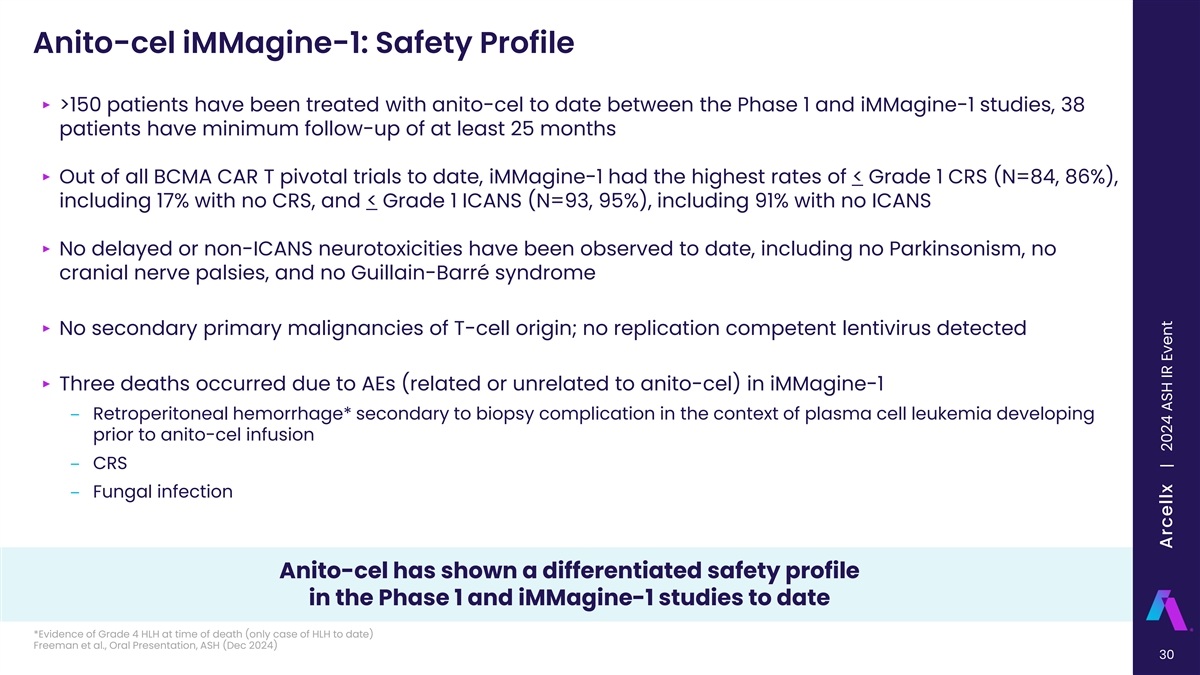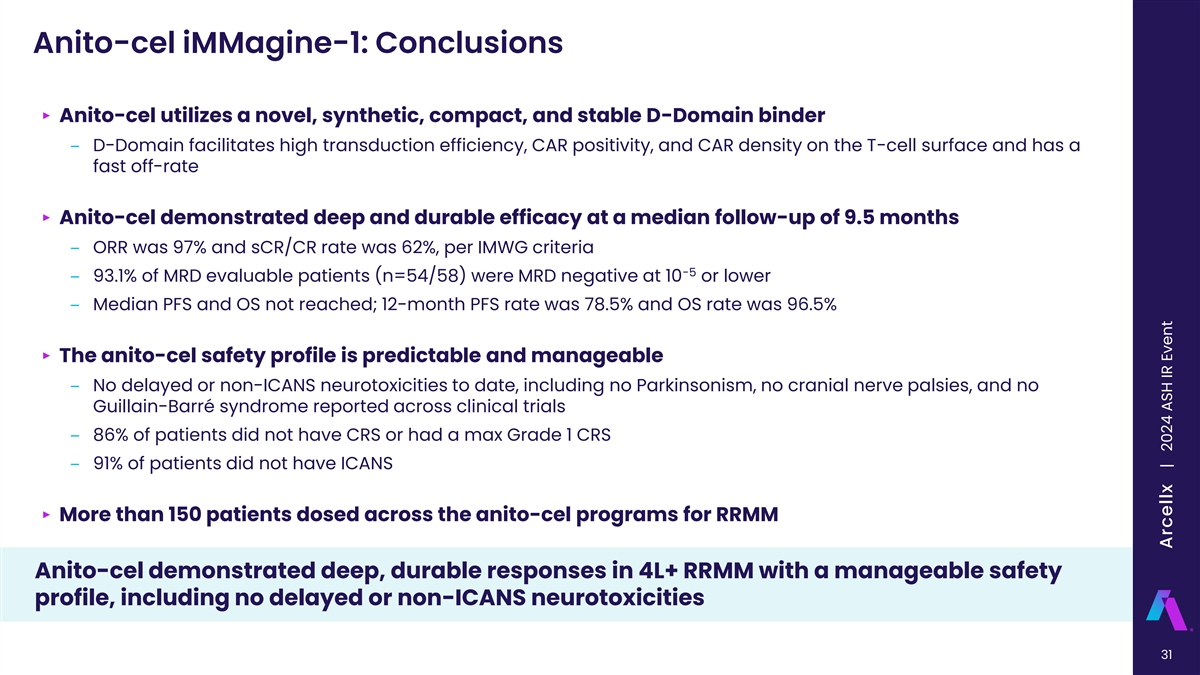 Anito-cel iMMagine-1: Safety Profile ‣ >150 patients have been treated with anito-cel to date between the Phase 1 and iMMagine-1 studies, 38 patients have minimum follow-up of at least 25 months ‣ Out of all BCMA CAR T pivotal trials to date, iMMagine-1 had the highest rates of < Grade 1 CRS (N=84, 86%), including 17% with no CRS, and < Grade 1 ICANS (N=93, 95%), including 91% with no ICANS ‣ No delayed or non-ICANS neurotoxicities have been observed to date, including no Parkinsonism, no cranial nerve palsies, and no Guillain-Barré syndrome ‣ No secondary primary malignancies of T-cell origin; no replication competent lentivirus detected ‣ Three deaths occurred due to AEs (related or unrelated to anito-cel) in iMMagine-1 ‒ Retroperitoneal hemorrhage* secondary to biopsy complication in the context of plasma cell leukemia developing prior to anito-cel infusion ‒ CRS ‒ Fungal infection Anito-cel has shown a differentiated safety profile in the Phase 1 and iMMagine-1 studies to date *Evidence of Grade 4 HLH at time of death (only case of HLH to date) Freeman et al., Oral Presentation, ASH (Dec 2024) 30 Arcellx | 2024 ASH IR Event
