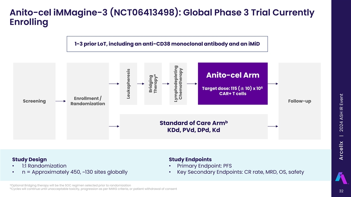 Anito-cel iMMagine-1: Conclusions ‣ Anito-cel utilizes a novel, synthetic, compact, and stable D-Domain binder ‒ D-Domain facilitates high transduction efficiency, CAR positivity, and CAR density on the T-cell surface and has a fast off-rate ‣ Anito-cel demonstrated deep and durable efficacy at a median follow-up of 9.5 months ‒ ORR was 97% and sCR/CR rate was 62%, per IMWG criteria -5 ‒ 93.1% of MRD evaluable patients (n=54/58) were MRD negative at 10 or lower ‒ Median PFS and OS not reached; 12-month PFS rate was 78.5% and OS rate was 96.5% ‣ The anito-cel safety profile is predictable and manageable ‒ No delayed or non-ICANS neurotoxicities to date, including no Parkinsonism, no cranial nerve palsies, and no Guillain-Barré syndrome reported across clinical trials ‒ 86% of patients did not have CRS or had a max Grade 1 CRS ‒ 91% of patients did not have ICANS ‣ More than 150 patients dosed across the anito-cel programs for RRMM Anito-cel demonstrated deep, durable responses in 4L+ RRMM with a manageable safety profile, including no delayed or non-ICANS neurotoxicities 31 | Freeman et al, American Society of Hematology 2024, Abstract 1031 Arcellx | 2024 ASH IR Event