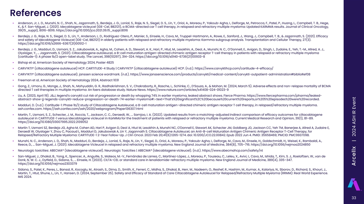 References ‣ Anderson, Jr, L. D., Munshi, N. C., Shah, N., Jagannath, S., Berdeja, J. G., Lonial, S., Raje, N. S., Siegel, D. S., Lin, Y., Oriol, A., Moreau, P., Yakoub-Agha, I., Delforge, M., Petrocca, F., Patel, P., Huang, L., Campbell, T. B., Hege, K., & F. San-Miguel, J. (2021). Idecabtagene vicleucel (IDE-Cel, BB2121), a BCMA-directed car T cell therapy, in relapsed and refractory multiple myeloma: Updated KARMMA results. Journal of Clinical Oncology, 39(15_suppl), 8016–8016. https://doi.org/10.1200/jco.2021.39.15_suppl.8016 ‣ Berdeja, J. G., Raje, N. S., Siegel, D. S., Lin, Y., Anderson, L. D., Rodriguez-Otero, P., Manier, S., Einsele, H., Cavo, M., Truppel-Hartmann, A., Rowe, E., Sanford, J., Wang, J., Campbell, T. B., & Jagannath, S. (2021). Efficacy and safety of Idecabtagene Vicleucel (IDE-Cel, BB2121) in elderly patients with relapsed and refractory multiple myeloma: Karmma subgroup analysis. Transplantation and Cellular Therapy, 27(3). https://doi.org/10.1016/s2666-6367(21)00512-1 ‣ Berdeja, J. G., Madduri, D., Usmani, S. Z., Jakubowiak, A., Agha, M., Cohen, A. D., Stewart, A. K., Hari, P., Htut, M., Lesokhin, A., Deol, A., Munshi, N. C., O’Donnell, E., Avigan, D., Singh, I., Zudaire, E., Yeh, T.-M., Allred, A. J., Olyslager, Y., … Jagannath, S. (2021). Ciltacabtagene autoleucel, a B-cell maturation antigen-directed chimeric antigen receptor T-cell therapy in patients with relapsed or refractory multiple myeloma (cartitude-1): A phase 1b/2 open-label study. The Lancet, 398(10297), 314–324. https://doi.org/10.1016/s0140-6736(21)00933-8 ‣ Bishop et al, American Society of Hematology 2024, Poster 4825 ‣ CARVYKTI® (ciltacabtagene autoleucel) HCP. CARTITUDE-4 Study | CARVYKTI® (ciltacabtagene autoleucel) HCP. (n.d.). https://www.carvyktihcp.com/cartitude-4-efficacy/ ‣ CARVYKTI® (ciltacabtagene autoleucel). janssen science wordmark. (n.d.). https://www.janssenscience.com/products/carvykti/medical-content/carvykti-outpatient-administration#biblioRef08 ‣ Freeman et al, American Society of Hematology 2024, Abstract 1031 ‣ Gong, Z., Umoru, G., Monge, J., Shah, N., Mohyuddin, G. R., Radhakrishnan, S. V., Chakraborty, R., Rasche, L., Schinke, C., D’Souza, A., & Mohan, M. (2024, March 5). Adverse effects and non-relapse mortality of BCMA directed T cell therapies in multiple myeloma: An faers database study. Nature News. https://www.nature.com/articles/s41408-024-01023-9 ‣ Liu, A. (2023, April 19). J&J, legend’s carvykti cut risk of progression or death by whopping 74% in earlier myeloma, leaked abstract shows. Fierce Pharma. https://www.fiercepharma.com/pharma/leaked- abstract-show-jj-legends-carvykti-reduce-progression-or-death-74-earlier-myeloma#:~:text=That’s%20significant%2C%20because%20current%20reports,or%205%20episodes%20were%20recorded. ‣ Madduri, D. (n.d.). Cartitude-1: Phase 1b/2 study of Ciltacabtagene Autoleucel, a B-cell maturation antigen–directed chimeric antigen receptor T cell therapy, in relapsed/refractory multiple myeloma. ash.confex.com. https://ash.confex.com/ash/2020/webprogram/Paper136307.html ‣ Martin, T., Usmani, S. Z., Schecter, J. M., Roccia, T., Jackson, C. C., Deraedt, W., … Samjoo, I. A. (2022). Updated results from a matching-adjusted indirect comparison of efficacy outcomes for ciltacabtagene autoleucel in CARTITUDE-1 versus idecabtagene vicleucel in KarMMa for the treatment of patients with relapsed or refractory multiple myeloma. Current Medical Research and Opinion, 39(1), 81–89. https://doi.org/10.1080/03007995.2022.2139052 ‣ Martin T, Usmani SZ, Berdeja JG, Agha M, Cohen AD, Hari P, Avigan D, Deol A, Htut M, Lesokhin A, Munshi NC, O'Donnell E, Stewart AK, Schecter JM, Goldberg JD, Jackson CC, Yeh TM, Banerjee A, Allred A, Zudaire E, Deraedt W, Olyslager Y, Zhou C, Pacaud L, Madduri D, Jakubowiak A, Lin Y, Jagannath S. Ciltacabtagene Autoleucel, an Anti-B-cell Maturation Antigen Chimeric Antigen Receptor T-Cell Therapy, for Relapsed/Refractory Multiple Myeloma: CARTITUDE-1 2-Year Follow-Up. J Clin Oncol. 2023 Feb 20;41(6):1265-1274. doi: 10.1200/JCO.22.00842. Epub 2022 Jun 4. PMID: 35658469; PMCID: PMC9937098. ‣ Munshi, N. C., Anderson, L. D., Shah, N., Madduri, D., Berdeja, J., Lonial, S., Raje, N., Lin, Y., Siegel, D., Oriol, A., Moreau, P., Yakoub-Agha, I., Delforge, M., Cavo, M., Einsele, H., Goldschmidt, H., Weisel, K., Rambaldi, A., Reece, D., … San-Miguel, J. (2021). Idecabtagene Vicleucel in relapsed and refractory multiple myeloma. New England Journal of Medicine, 384(8), 705–716. https://doi.org/10.1056/nejmoa2024850 ‣ Neurologic toxicities: ABECMA® (idecabtagene vicleucel). Neurologic Toxicities | ABECMA® (idecabtagene vicleucel). (n.d.). https://www.abecmahcp.com/safety/nt ‣ San-Miguel, J., Dhakal, B., Yong, K., Spencer, A., Anguille, S., Mateos, M.-V., Fernández de Larrea, C., Martínez-López, J., Moreau, P., Touzeau, C., Leleu, X., Avivi, I., Cavo, M., Ishida, T., Kim, S. J., Roeloffzen, W., van de Donk, N. W. C. J., Dytfeld, D., Sidana, S., … Einsele, H. (2023). CILTA-CEL or standard care in lenalidomide-refractory multiple myeloma. New England Journal of Medicine, 389(4), 335–347. https://doi.org/10.1056/nejmoa2303379 ‣ Sidana, S., Patel, K., Peres, L., Bansal, R., Kocoglu, M., Atrash, S., Dima, D., Smith, K., Ferreri, C., Midha, S., Dhakal, B., Herr, M., Nadeem, O., Reshef, R., Hashim, M., Kumar, A., Kalariya, N., Sborov, D., Richard, S., Khouri, J., Martin, T., Htut, Shune, L., Lin, Y., Hansen, D. (2024, September 25). Safety and Efficacy of Standard of Care Ciltacabtagene Autoleucel for Relapsed/Refractory Multiple Myeloma (RRMM): Real World Experience. IMS 2024. 33 Arcellx | 2024 ASH IR Event
