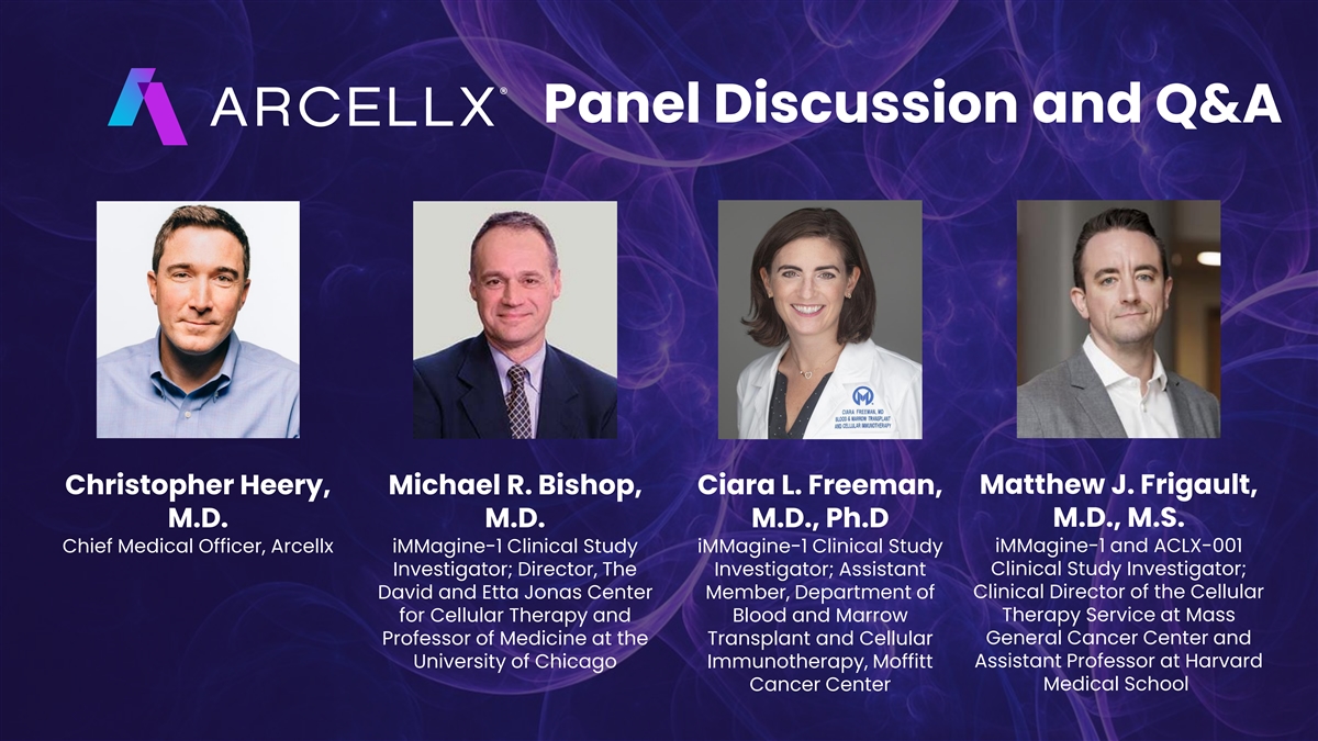 Panel Discussion and Q&A Christopher Heery, Michael R. Bishop, Ciara L. Freeman, Matthew J. Frigault, M.D. M.D. M.D., Ph.D M.D., M.S. Chief Medical Officer, Arcellx iMMagine-1 Clinical Study iMMagine-1 Clinical Study iMMagine-1 and ACLX-001 Clinical Study Investigator; Investigator; Director, The Investigator; Assistant Clinical Director of the Cellular David and Etta Jonas Center Member, Department of for Cellular Therapy and Blood and Marrow Therapy Service at Mass Professor of Medicine at the Transplant and Cellular General Cancer Center and University of Chicago Immunotherapy, Moffitt Assistant Professor at Harvard Medical School Cancer Center