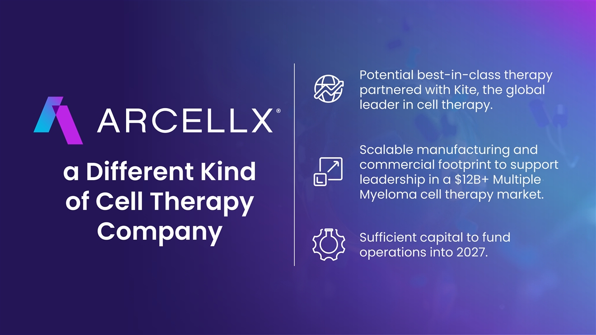 Potential best-in-class therapy partnered with Kite, the global leader in cell therapy. Scalable manufacturing and commercial footprint to support a Different Kind leadership in a $12B+ Multiple Myeloma cell therapy market. of Cell Therapy Company Sufficient capital to fund operations into 2027.