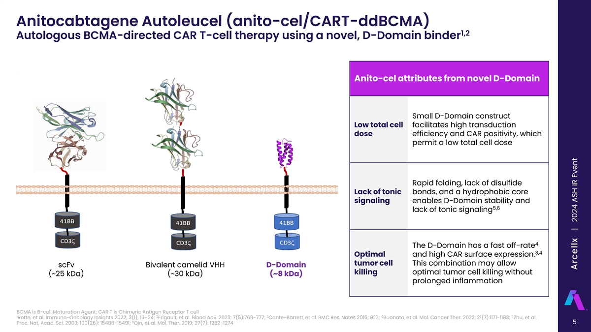 Anitocabtagene Autoleucel (anito-cel/CART-ddBCMA) 1,2 Autologous BCMA-directed CAR T-cell therapy using a novel, D-Domain binder Anito-cel attributes from novel D-Domain Small D-Domain construct Low total cell facilitates high transduction dose efficiency and CAR positivity, which permit a low total cell dose Rapid folding, lack of disulfide Lack of tonic bonds, and a hydrophobic core signaling enables D-Domain stability and 5,6 lack of tonic signaling 4 The D-Domain has a fast off-rate 3,4 Optimal and high CAR surface expression. tumor cell This combination may allow scFv Bivalent camelid VHH D-Domain killing optimal tumor cell killing without (~25 kDa) (~30 kDa) (~8 kDa) prolonged inflammation BCMA is B-cell Maturation Agent; CAR T is Chimeric Antigen Receptor T cell 1 2 3 4 5 Rotte, et al. Immuno-Oncology Insights 2022; 3(1), 13–24; Frigault, et al. Blood Adv. 2023; 7(5):768-777; Cante-Barrett, et al. BMC Res. Notes 2016; 9:13; Buonato, et al. Mol. Cancer Ther. 2022; 21(7):1171-1183; Zhu, et al. 6 5 Proc. Nat. Acad. Sci. 2003; 100(26): 15486-15491; Qin, et al. Mol. Ther. 2019; 27(7): 1262-1274 Arcellx | 2024 ASH IR Event