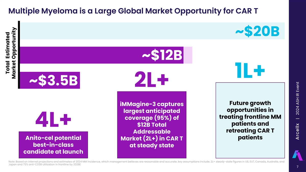 Anito-cel: The BCMA CAR T Without Compromise Potential Best-in-Class Differentiated Safety Profile Rapid and Reliable Efficacy Profile with No Delayed Neurotoxicity Manufacturing 1 ‣ Phase 1 median PFS of 30.2 months‣ Zero cases of delayed neurotoxicity ‣ <17-day turnaround time for or other non-ICANS neurotoxicity patients treated in iMMagine-3, in seen in >150 patients treated with line with other Kite commercial ‣ iMMagine-1 pivotal trial consistent anito-cel to date CAR Ts with Phase 1 findings, with comparable ORR, CRR, MRD-, and 6- and 12-mo PFS and OS %‣ iMMagine-1 had highest rates of ‣ 96% commercial manufacturing < Grade 1 CRS (86%) and no ICANS success rate with >25,000 patients 1 (91%) out of all BCMA CAR T pivotal treated from Kite’s global CAR T ‣ Similar efficacy profile, with trials infrastructure comparable depth and durability of responses observed across high- risk subgroups‣ Favorable safety profile can get ‣ Expansive market presence with 1 patients home sooner, expanding 500+ ATCs globally will provide capacity at hospitals, and lowering unparalleled access to anito-cel resource utilization / cost of care ORR is Overall Response Rate; CRR is Complete Response Rate; MRD is Minimum Residual Disease; PFS is Progression Free Survival; OS is Overall Survival; ICANS is Immune Effector Cell-associated Neurotoxicity 1 Syndrome, CRS is Cytokine Release Syndrome; Kite Data 6 Arcellx | 2024 ASH IR Event