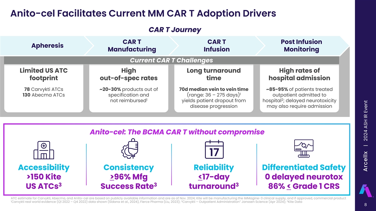 Multiple Myeloma is a Large Global Market Opportunity for CAR T ~$20B ~$12B 1L+ ~$3.5B 2L+ Future growth iMMagine-3 captures opportunities in largest anticipated treating frontline MM coverage (95%) of patients and 4L+ $12B Total retreating CAR T Addressable patients Anito-cel potential Market (2L+) in CAR T best-in-class at steady state candidate at launch Note: Based on internal projections and estimates of 2024 MM Incidence, which management believes are reasonable and accurate, key assumptions include: 2L+ steady-state figures in US, EU7, Canada, Australia, and Japan and 75% anti-CD38 utilization in frontline by 2028E 7 Total Estimated Market Opportunity Arcellx | 2024 ASH IR Event