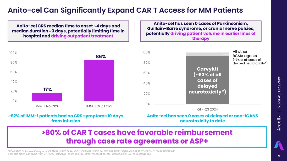 Anito-cel Facilitates Current MM CAR T Adoption Drivers CAR T Journey CAR T CAR T Post Infusion Apheresis Manufacturing Infusion Monitoring Current CAR T Challenges Limited US ATC High Long turnaround High rates of footprint out-of-spec rates time hospital admission 78 Carvykti ATCs ~20-30% products out of 70d median vein to vein time ~85-95% of patients treated 1 130 Abecma ATCs specification and (range: 36 – 275 days) outpatient admitted to 1 2 not reimbursed yields patient dropout from hospital ; delayed neurotoxicity disease progression may also require admission Anito-cel: The BCMA CAR T without compromise Accessibility Consistency Reliability Differentiated Safety >150 Kite >96% Mfg <17-day 0 delayed neurotox 3 3 3 US ATCs Success Rate turnaround 86% < Grade 1 CRS ATC estimate for Carvykti, Abecma, and Anito-cel are based on publicly available information and are as of Nov. 2024; Kite will be manufacturing the iMMagine-3 clinical supply, and if approved, commercial product 1 2 3 Carvykti real world evidence (Q1 2022 – Q4 2022) data shown (Sidana et al., 2024), Fierce Pharma (Liu, 2023); Carvykti – Outpatient Administration” Janssen Science (Apr 2024); Kite Data 8 Arcellx | 2024 ASH IR Event